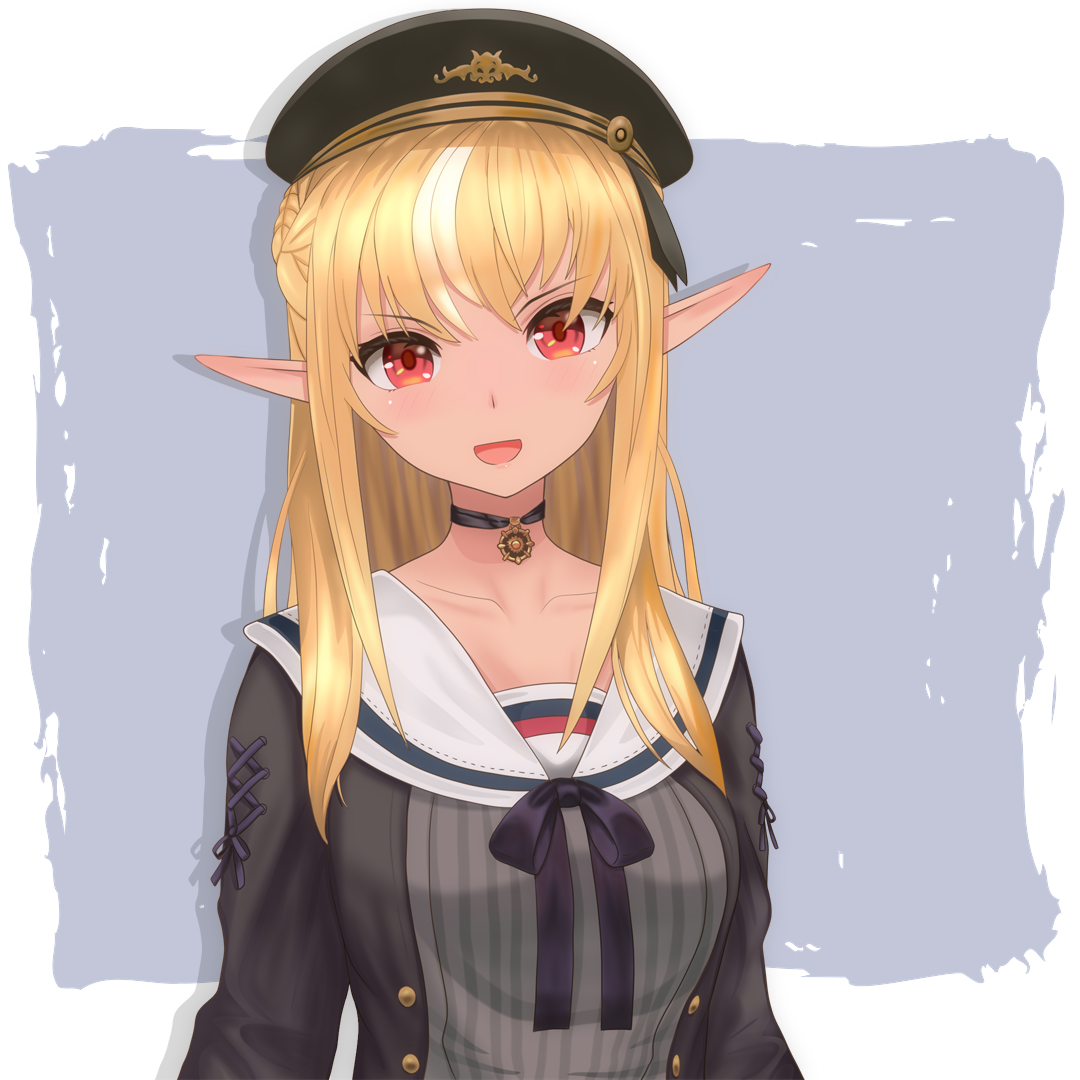 1girl :d bangle beret blonde_hair bracelet braid breasts choker collarbone dark-skinned_female dark_elf dark_skin dress elf esuki french_braid half_updo hand_up hat hololive jewelry light_blush long_hair long_sleeves looking_at_viewer medium_breasts multicolored_hair open_mouth pendant pinstripe_dress pinstripe_pattern pointy_ears red_eyes sailor_collar sailor_dress shiranui_flare shiranui_flare_(street) smile solo streaked_hair striped upper_body virtual_youtuber