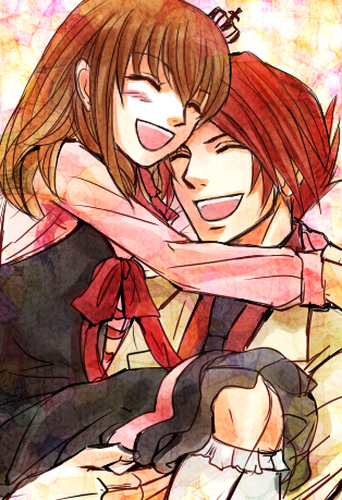 00s 1boy 1girl bad_id bad_pixiv_id cousins crown dress formal_clothes jacket kaoru lowres necktie orange_hair red_hair ribbon smile umineko_no_naku_koro_ni ushiromiya_battler ushiromiya_maria