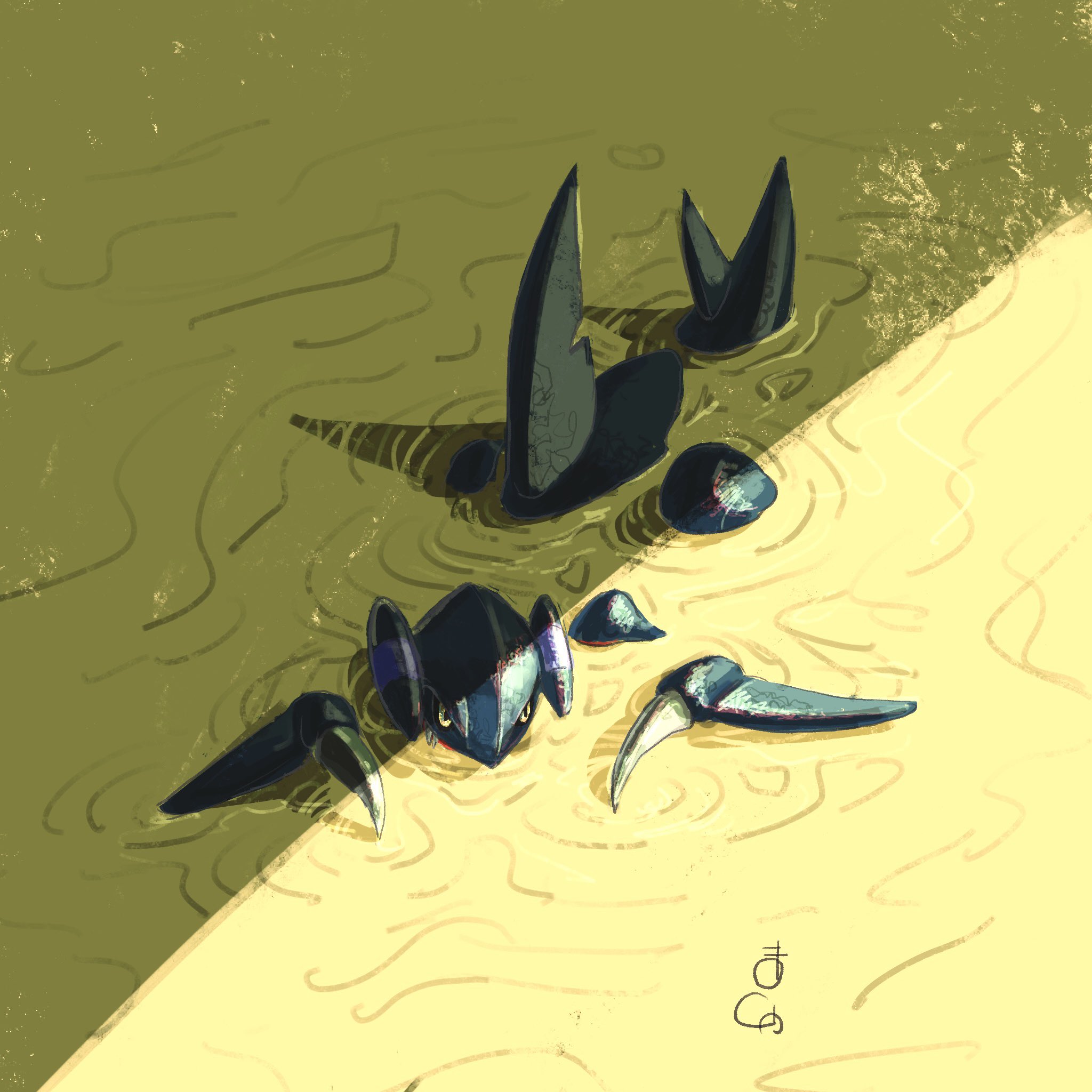 black_sclera claws colored_sclera commentary_request from_above garchomp gen_4_pokemon highres masshu_(shu_123426) nintendo no_humans pokemon pokemon_(creature) sand shadow solo yellow_eyes