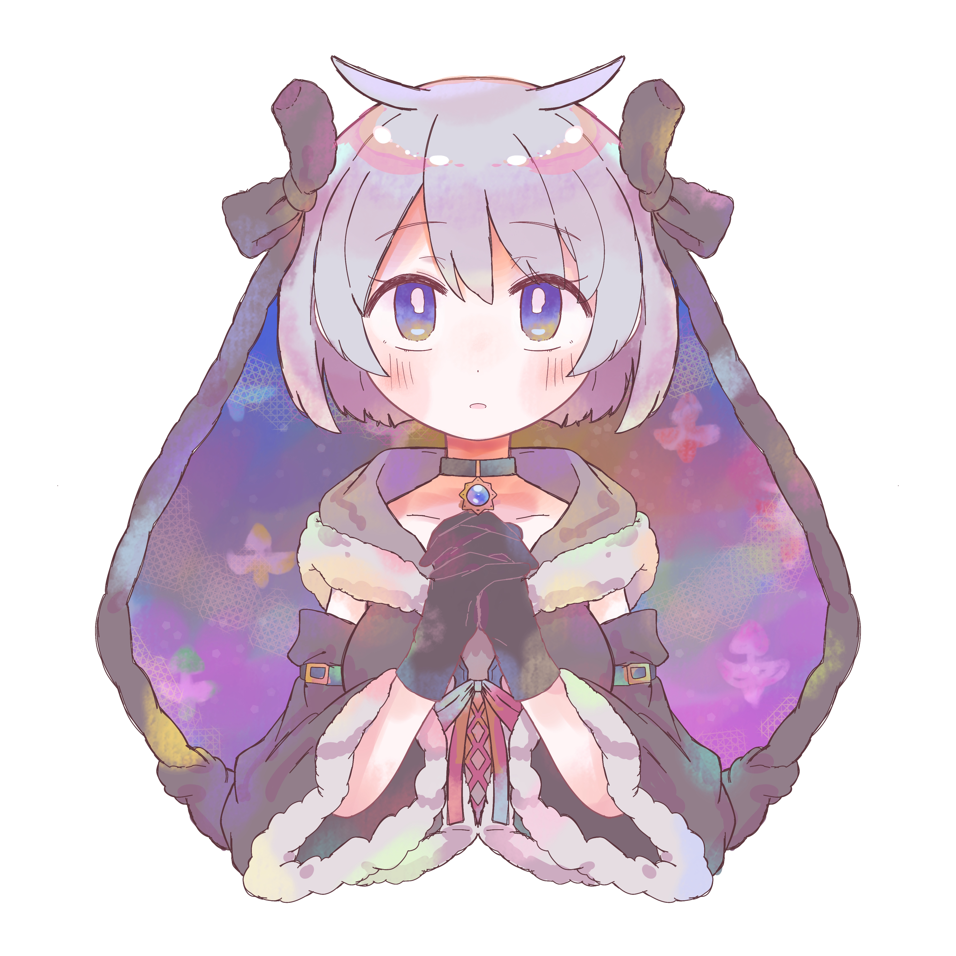 1girl :o absurdres azusa_mifuyu bad_id bad_pixiv_id belt_buckle black_choker black_gloves blue_eyes buckle choker detached_sleeves fur-trimmed_sleeves fur_trim gloves hair_ornament hara_(nanohara) highres long_sleeves magia_record:_mahou_shoujo_madoka_magica_gaiden mahou_shoujo_madoka_magica open_mouth own_hands_together ribbon short_hair solo soul_gem white_background white_hair