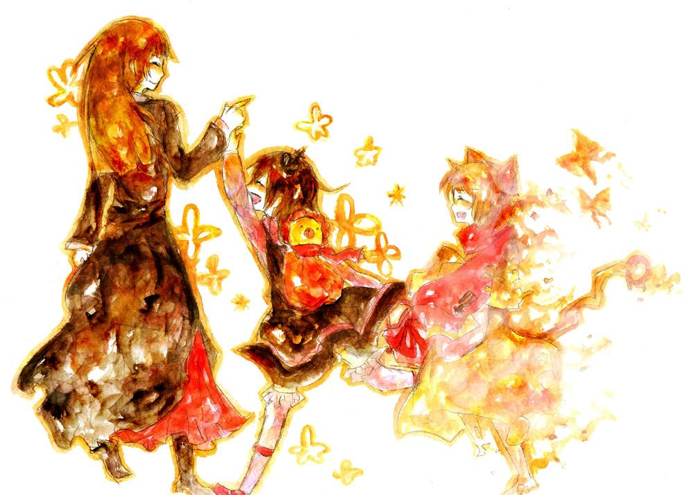 00s 1boy 2girls ^_^ ^o^ backpack bad_id bad_pixiv_id bag black_dress blush brown_hair closed_eyes dress height_difference holding_hands kaio_(watagami) multiple_girls orange_hair painting_(medium) running sakutarou_(umineko) short_hair simple_background stuffed_animal stuffed_toy teddy_bear traditional_media umineko_no_naku_koro_ni ushiromiya_maria ushiromiya_rosa walking watercolor_(medium) white_background yukaio