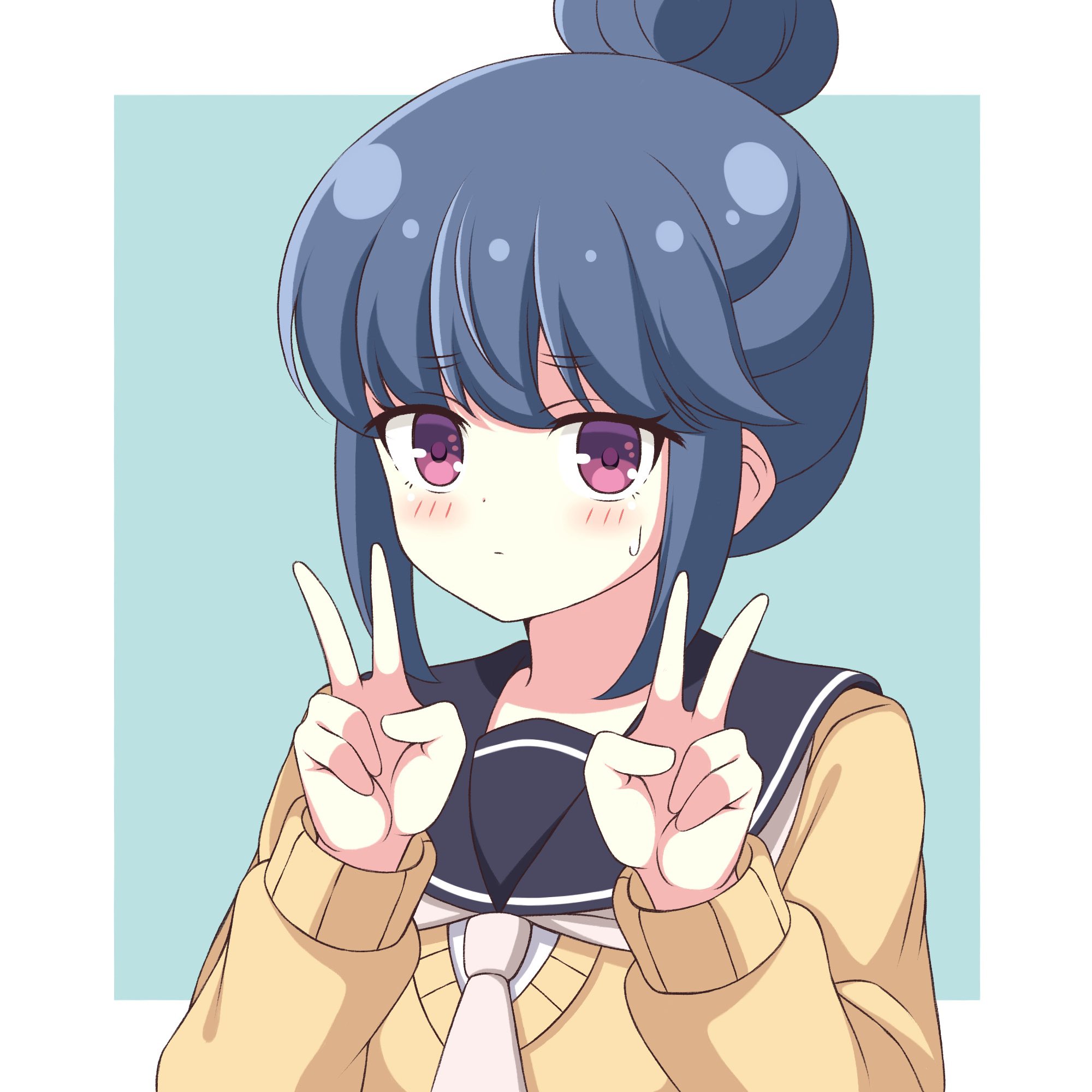 1girl bad_id bad_twitter_id black_sailor_collar blue_hair blush border closed_mouth commentary double_v green_background grey_necktie hair_bun hands_up highres long_sleeves looking_at_viewer necktie sailor_collar school_uniform shima_rin short_hair simple_background single_hair_bun solo sweatdrop sweater upper_body v white_border yellow_sweater yurucamp zeta_(24904340)
