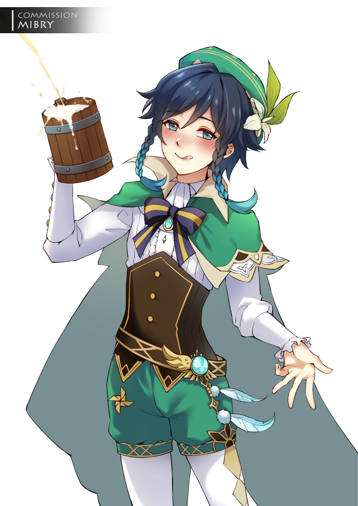 1boy :q alcohol artist_name beer beer_mug black_hair blue_hair blush braid cape closed_mouth commentary commission cowboy_shot cup english_commentary flower genshin_impact gradient_hair green_cape green_eyes green_hat green_shorts hair_between_eyes hair_ornament hat hat_flower holding holding_cup long_sleeves looking_at_viewer male_focus mibry_(phrysm) mug multicolored_hair nose_blush pantyhose saliva shirt short_shorts shorts sidelocks simple_background smile solo standing tongue tongue_out twin_braids venti_(genshin_impact) vision_(genshin_impact) white_background white_pantyhose white_shirt