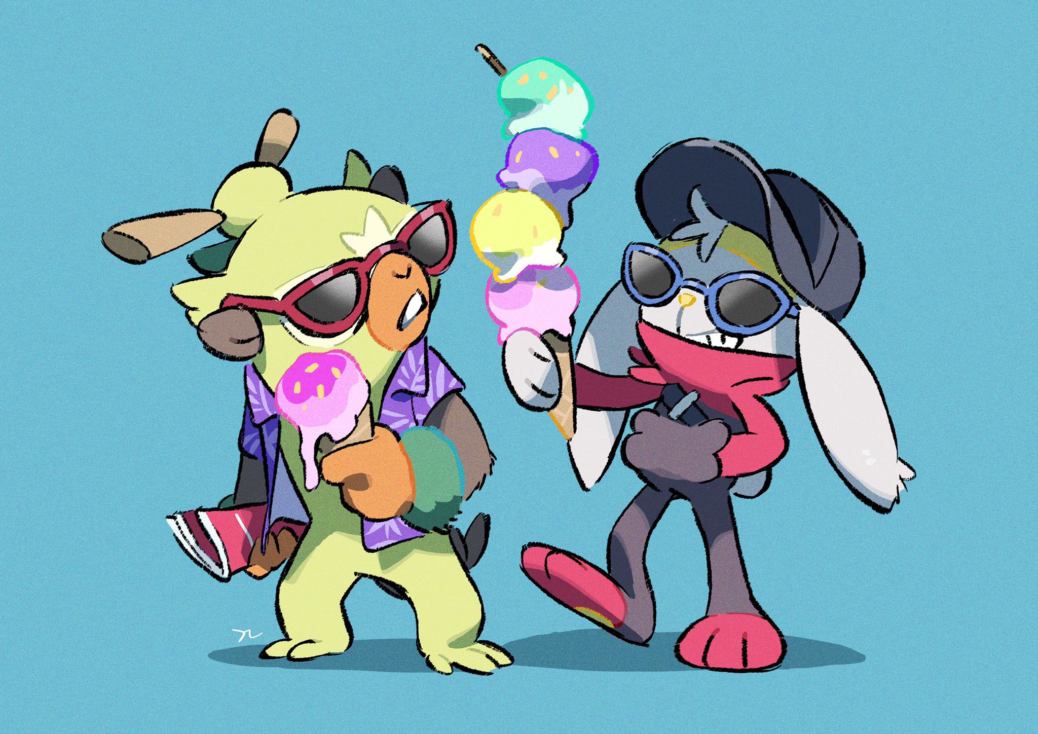 baseball_cap black_headwear blue-framed_eyewear chibikemo clothed_pokemon collared_shirt commentary_request food gen_8_pokemon hand_in_pocket hat hemhemhoo highres holding ice_cream ice_cream_cone looking_back nintendo open_clothes open_shirt pokemon pokemon_(creature) purple_shirt raboot red-framed_eyewear shirt smile standing sunglasses thwackey