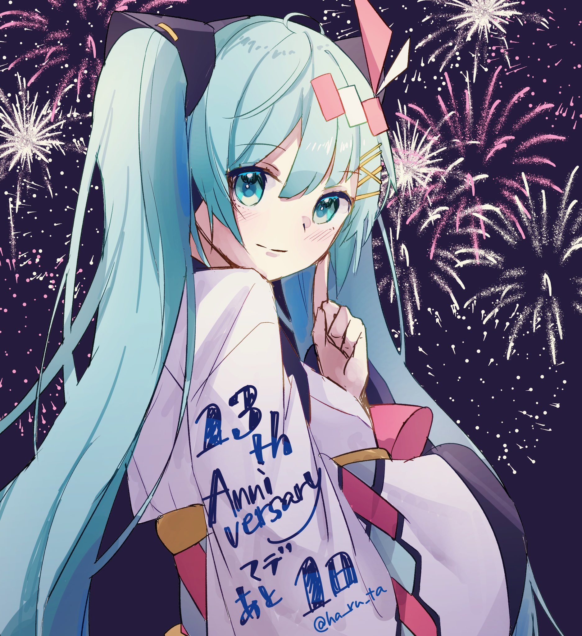 1girl aerial_fireworks anniversary blush closed_mouth fireworks green_eyes green_hair hair_between_eyes hair_ornament hairclip hand_up haruta_(user_dndp3458) hatsune_miku highres japanese_clothes kimono long_hair long_sleeves magical_mirai_miku magical_mirai_miku_(2020_summer) night outdoors sky smile solo twintails upper_body very_long_hair vocaloid white_kimono wide_sleeves x_hair_ornament
