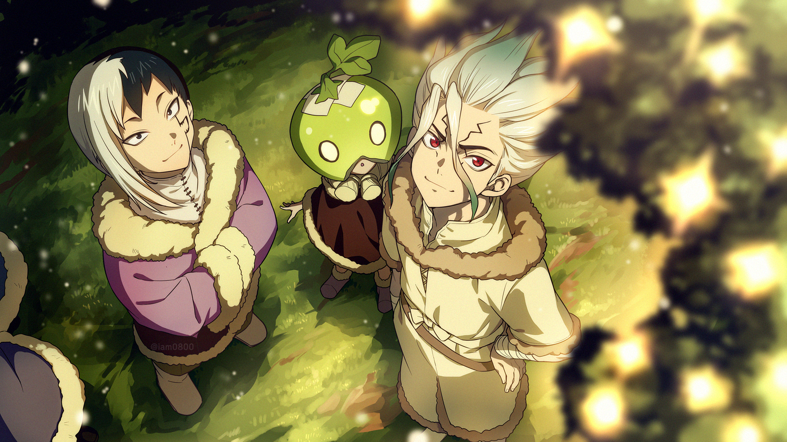 1girl 2boys :o arm_at_side asada_hachi asagiri_gen bandaged_arm bandages black_hair blue_eyes blurry boots brown_footwear child closed_mouth clothing_request coat commentary_request depth_of_field dr._stone food food_on_head from_above fruit fur-trimmed_coat fur_trim grass hair_between_eyes hand_on_own_hip hands_in_opposite_sleeves highres ishigami_senkuu long_hair long_sleeves looking_at_viewer looking_to_the_side looking_up multicolored_hair multiple_boys object_on_head outdoors purple_coat purple_footwear red_eyes revision shadow short_hair smile spiked_hair standing suika_(dr._stone) twitter_username two-tone_hair watermark watermelon white_hair