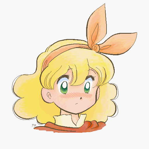 blonde_hair blush closed_mouth commentary_request ellen_fuwafuwaatama_aureus green_eyes hair_between_eyes hairband hatarakimono jf medium_hair oekaki orange_hairband portrait signature simple_background solo takemoto_izumi_(style) wavy_hair white_background