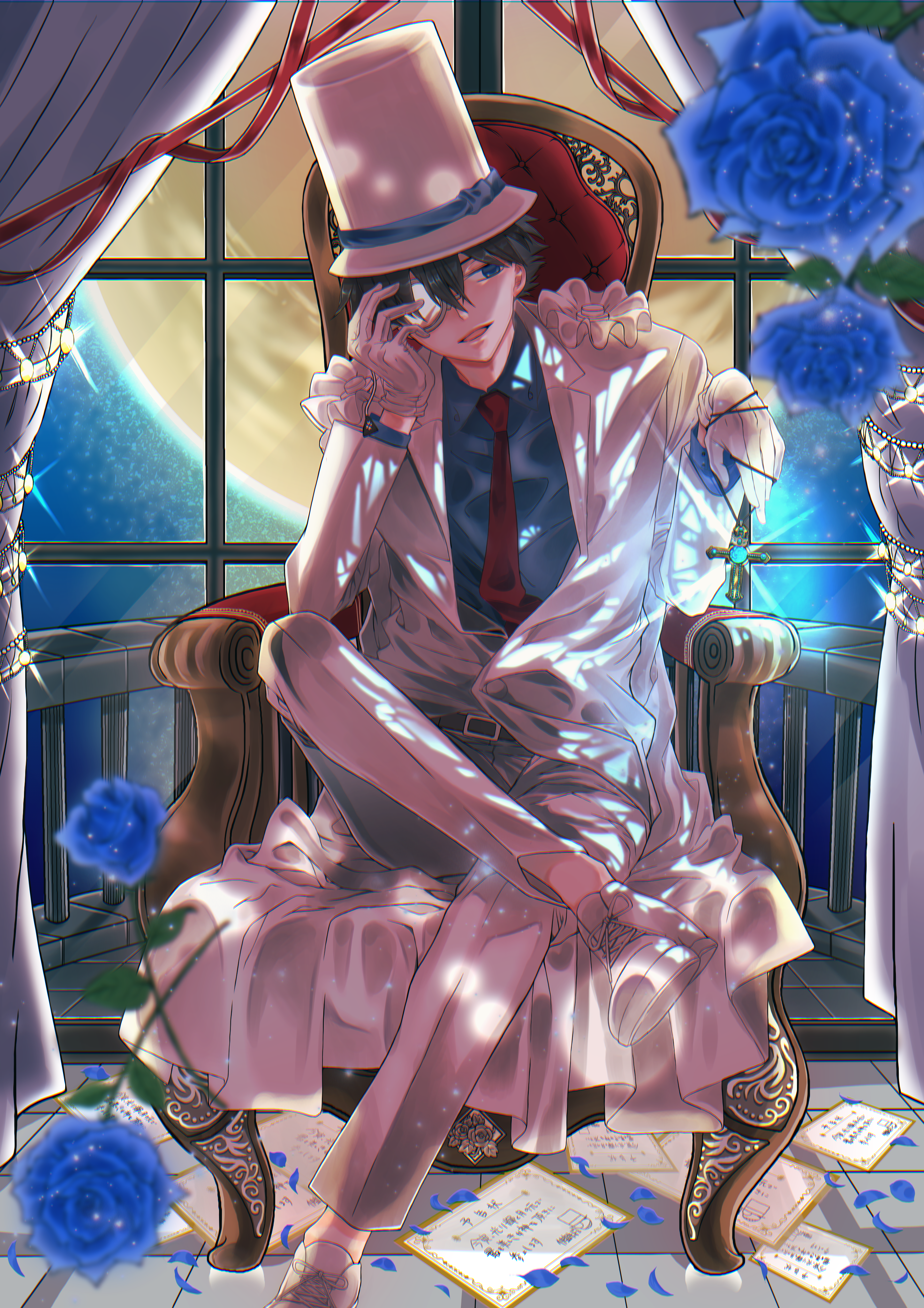 1boy absurdres aki_konoe belt black_hair blue_eyes blue_flower blue_rose blurry blurry_foreground calling_card cape collared_shirt commentary_request cross cross_necklace crossed_legs curtains dress_shirt flower formal_clothes full_moon glowing hair_between_eyes hand_up hat highres holding holding_jewelry holding_necklace huge_filesize indoors jacket jewelry kaitou_kid long_sleeves looking_to_the_side magic_kaito male_focus meitantei_conan monocle monocle_chain moon necklace necktie night on_throne open_mouth pants petals red_necktie rose shirt shoes short_hair sitting sky smile solo suit throne tile_floor tiles top_hat translation_request white_cape white_hat white_jacket white_pants white_shoes white_suit window