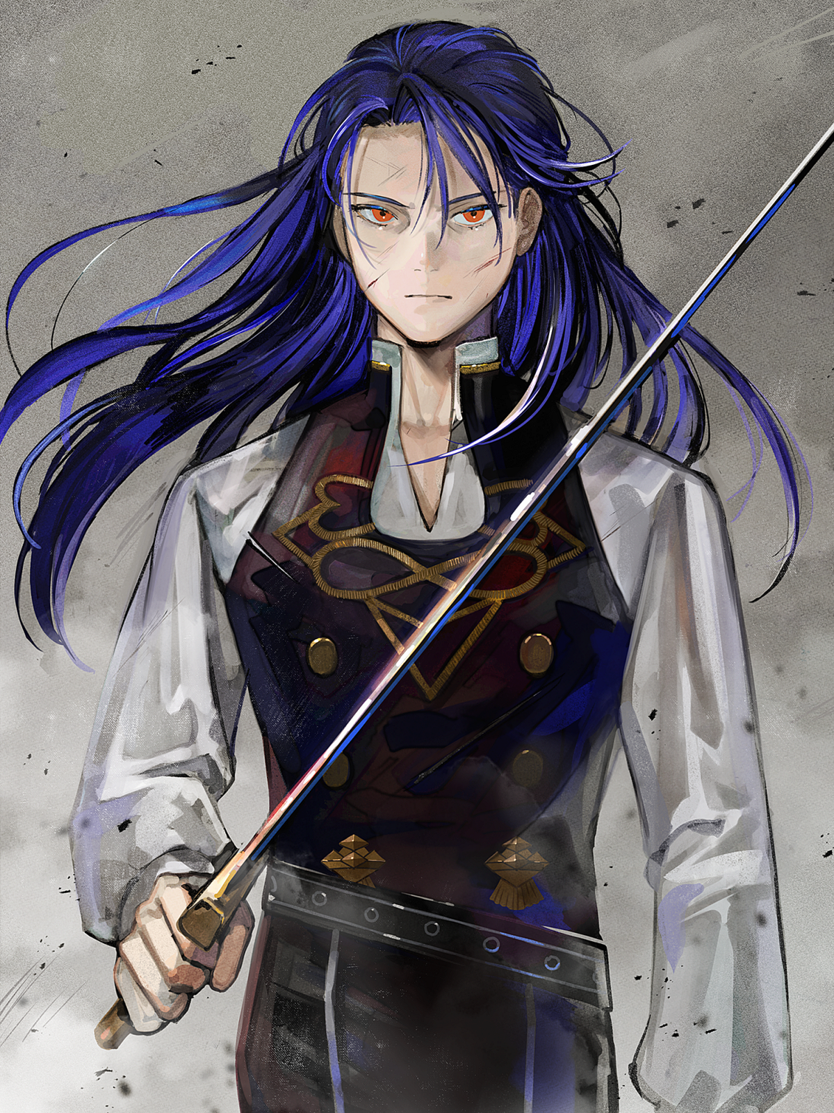 1boy blue_hair commentary_request felix_hugo_fraldarius fire_emblem fire_emblem:_three_houses garreg_mach_monastery_uniform highres holding holding_weapon kyufe long_hair male_focus nintendo orange_eyes scratches solo sword weapon