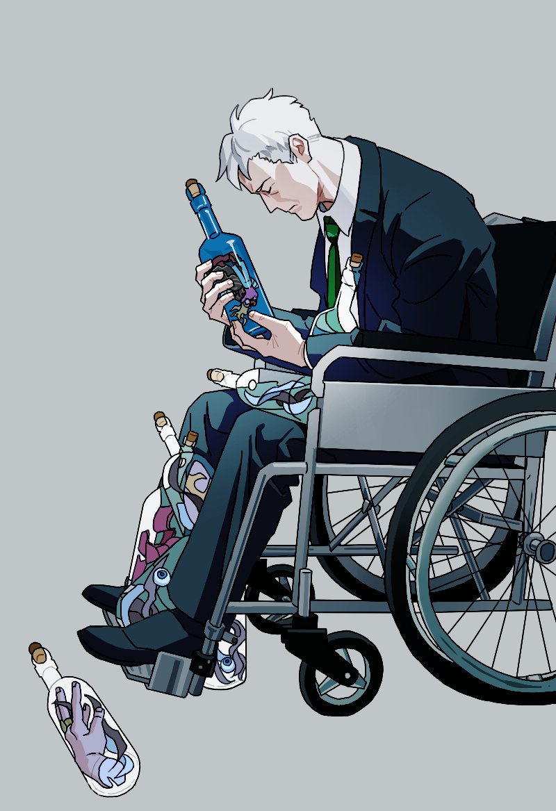 1boy aged_up beatrice_(umineko) becomeafish black_suit bottle cork formal_clothes green_necktie hachijou_tooya holding holding_bottle male_focus message_in_a_bottle necktie solo spoilers suit umineko_no_naku_koro_ni ushiromiya_battler wheelchair white_hair