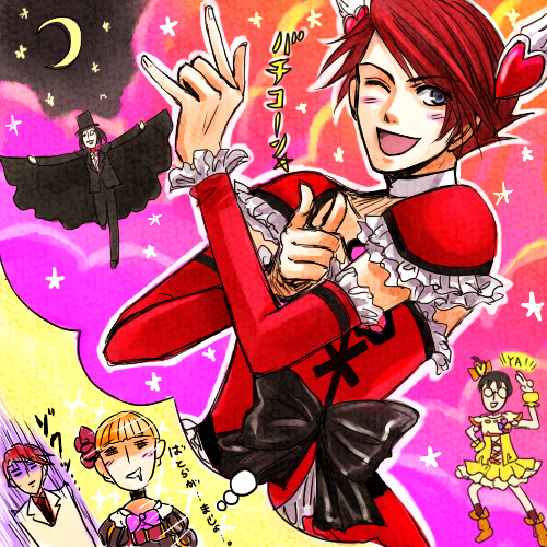 1girl 3boys bad_id bad_pixiv_id beatrice_(umineko) bishoujo_senshi_sailor_moon bow chiba_mamoru choker cosplay crossdressing cure_passion cure_passion_(cosplay) cure_pine cure_pine_(cosplay) fresh_precure! hair_ornament heart heart_hair_ornament imagining kaoru lowres magical_girl multiple_boys parody pink_bow precure ronove_(umineko) tsuki_ni_kawatte_oshioki_yo tuxedo tuxedo_kamen tuxedo_kamen_(cosplay) umineko_no_naku_koro_ni ushiromiya_battler ushiromiya_george waist_bow white_choker