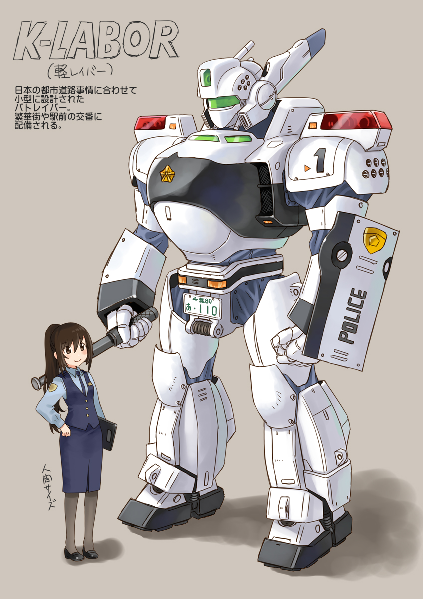 1girl av-98_ingram baton beige_background blue_neckwear blue_shirt blue_skirt brown_eyes brown_hair clenched_hand clipboard collared_shirt hand_on_own_hip highres holding holding_clipboard holding_weapon katahira_masashi kidou_keisatsu_patlabor mecha necktie police ponytail robot shield shirt simple_background skirt standing visor weapon
