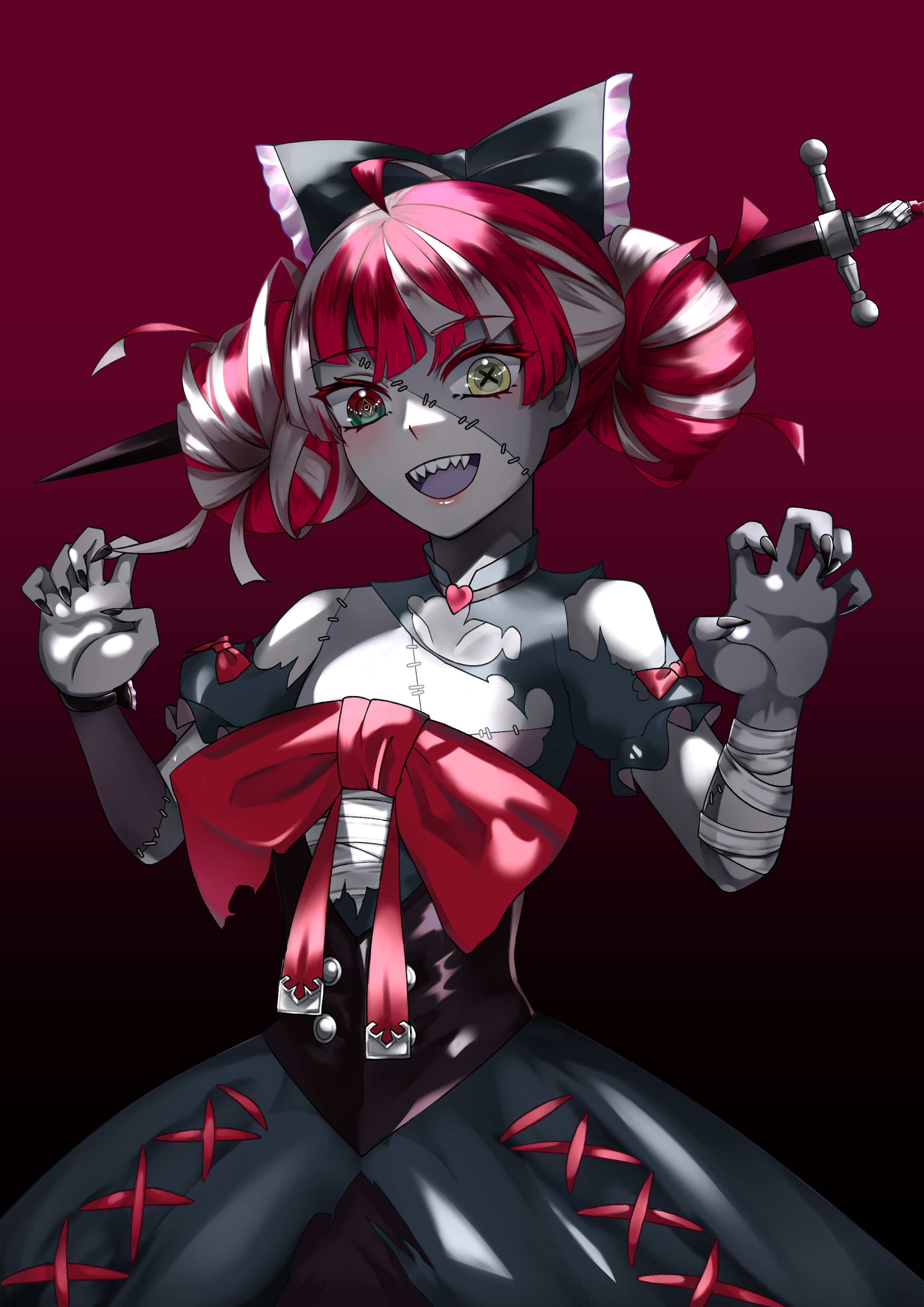 1girl absurdres ahoge arms_up bandaged_arm bandages black_background black_skirt blouse bow claw_pose colored_skin commentary cowboy_shot double_bun drill_hair ecrof_(ecrof_x) fingernails gradient_background hair_bow hair_bun heterochromia highres hololive hololive_indonesia holoro impaled kureiji_ollie looking_at_viewer multicolored_hair multicolored_skin open_mouth puffy_short_sleeves puffy_sleeves red_background red_bow red_eyes red_hair sarashi sharp_fingernails sharp_teeth shirt short_hair short_sleeves silver_hair skirt solo standing stitched_arm stitched_face stitched_torso stitches sword teeth torn_clothes torn_shirt two-tone_hair two-tone_skin upper_teeth_only virtual_youtuber weapon yellow_eyes zombie