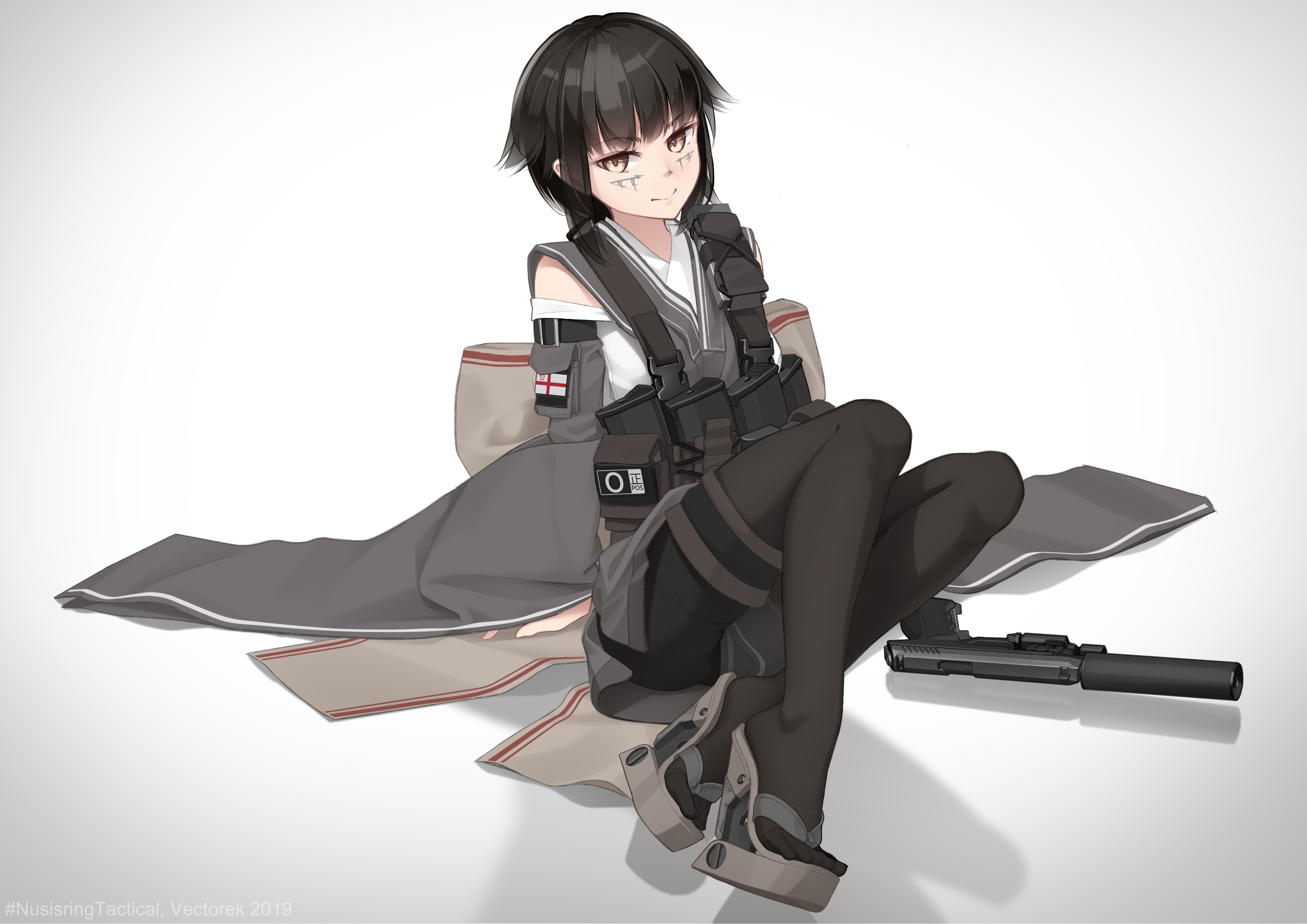 1girl absurdres black_hair black_pantyhose brown_eyes closed_mouth clothing_cutout crossed_ankles dress emblem facial_mark grey_background grey_dress grey_sandals gun handgun harness high_heel_sandals high_heels highres kenjuu_kiri long_sleeves looking_at_viewer magazine_(weapon) original pantyhose platform_clogs platform_mules sandals shadow short_dress shoulder_cutout sitting smile solo suppressor thigh_strap vectorek weapon wide_sleeves