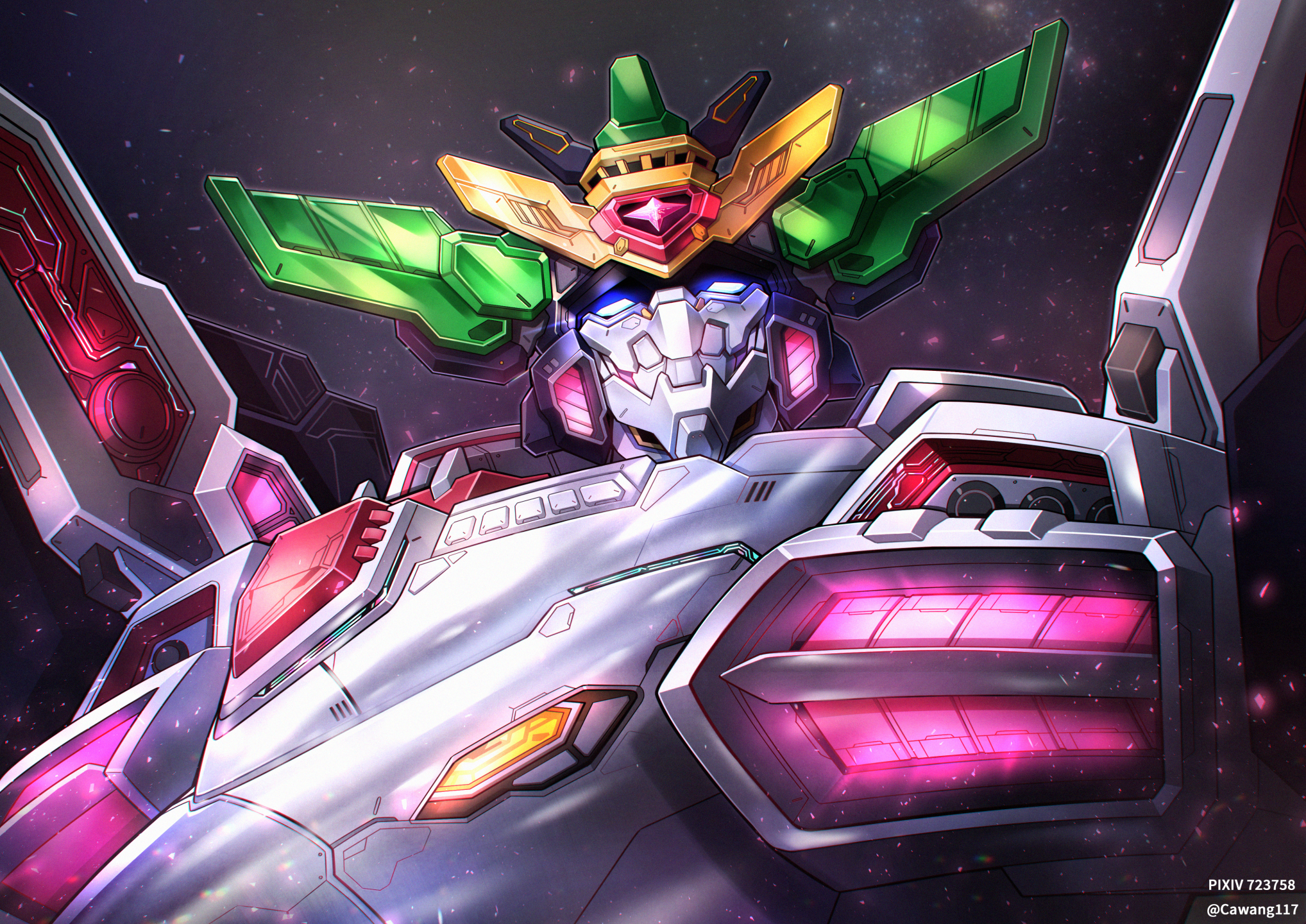 artist_name cawang glowing glowing_eyes highres king_j-der looking_up mecha no_humans pixiv_id robot science_fiction solo space super_robot twitter_username v-fin yuusha_ou_gaogaigar yuusha_series