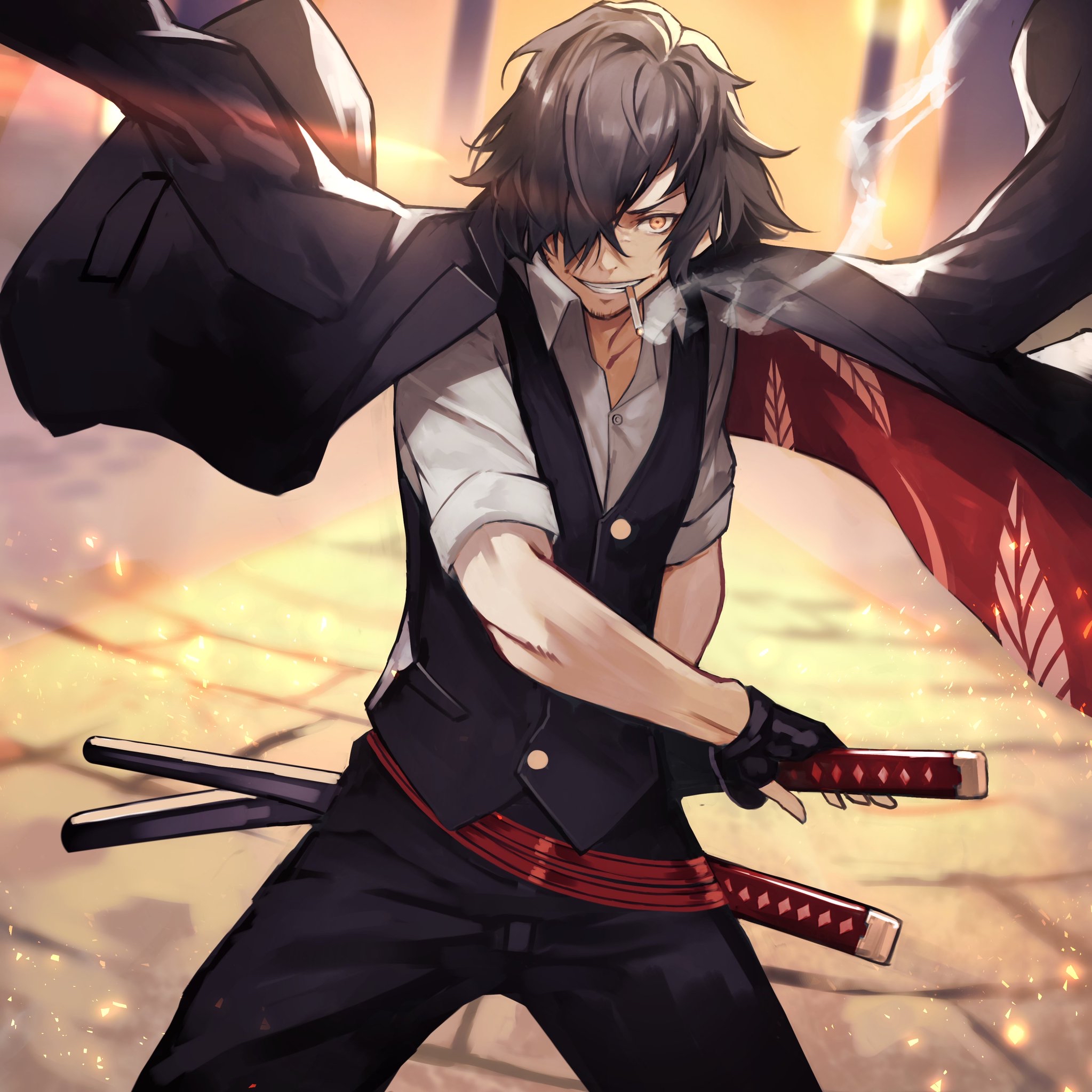 1boy alternate_costume black_hair black_pants black_vest blouse cigarette collared_shirt cowboy_shot fate/grand_order fate_(series) fighting_stance hair_over_one_eye highres jacket jacket_on_shoulders katana koha-ace long_hair looking_at_viewer male_focus okada_izou_(fate) okada_izou_(i'm_one_dapping_fella)_(fate) pants partially_unbuttoned ready_to_draw sheath shirt sleeves_rolled_up smile smoke smoking solo sword unsheathing vest weapon white_shirt yoshio_(55level)