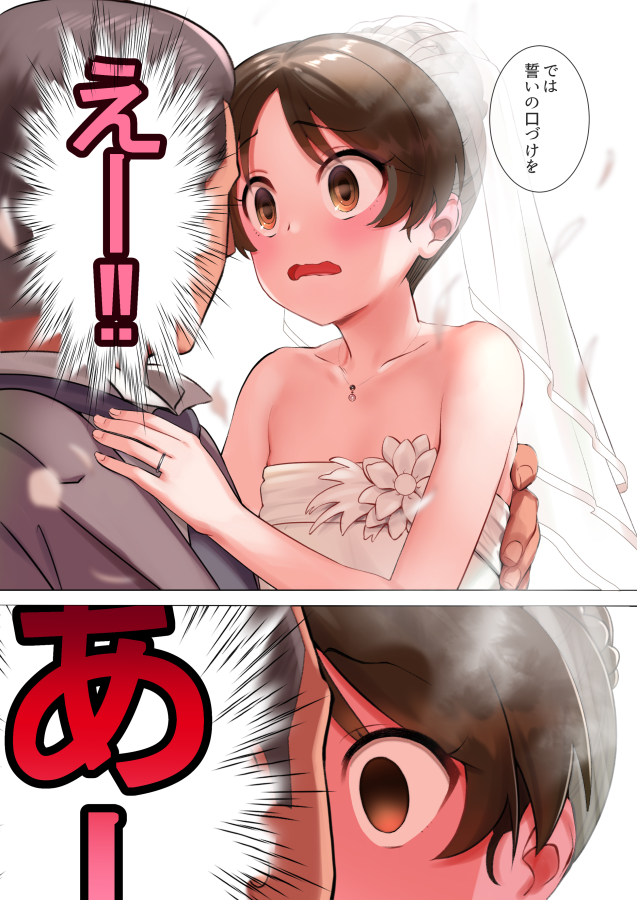 1boy 1girl aged_up backlighting bare_arms bare_shoulders black_hair bridal_veil brown_eyes dress empty_eyes formal_clothes grey_jacket hair_bun hetero idolmaster idolmaster_cinderella_girls jacket jewelry open_mouth parted_bangs pettan_p ring single_hair_bun strapless strapless_dress suit surprised tachibana_arisu translation_request veil wavy_mouth wedding wedding_band wedding_dress white_dress