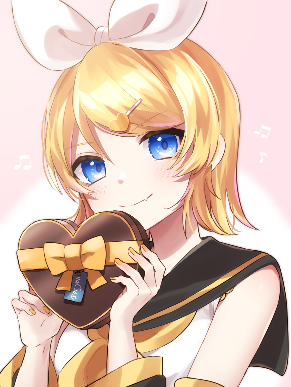 1girl arm_warmers beamed_eighth_notes black_collar blonde_hair blue_eyes bow box box_of_chocolates candy chocolate chocolate_heart collar commentary eighth_note english_text fang food hair_bow hair_ornament hairclip heart highres holding holding_box kagamine_rin looking_at_viewer musical_note nail_polish pink_background ribbon sailor_collar school_uniform shirt short_hair skin_fang sleeveless sleeveless_shirt smile solo soramame_pikuto swept_bangs upper_body valentine vocaloid white_bow white_shirt yellow_nails