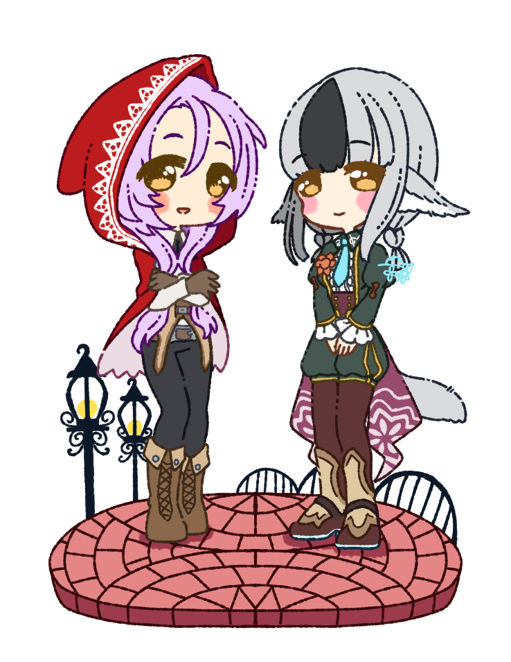 2girls alternate_costume animal_ears belt black_hair black_jacket black_pants black_shorts blue_neckwear blush blush_stickers boots braid breasts brown_footwear cloak clorica_(rune_factory) clorica_(rune_factory)_(cosplay) closed_mouth cosplay costume_switch cross-laced_footwear crossed_arms crossover female_focus fire_emblem fire_emblem_fates flower frilled_shirt frilled_sleeves frills full_body grey_hair happy hood hooded_cloak jacket lamppost legs_together long_hair long_sleeves looking_at_viewer muguet multicolored_hair multiple_girls necktie nintendo open_clothes open_jacket open_mouth orange_flower own_hands_together pants purple_hair red_cloak rune_factory rune_factory_4 shirt short_shorts shorts sidelocks simple_background small_breasts smile standing tail thigh_boots thighhighs twin_braids two-tone_hair v_arms velouria_(fire_emblem) velouria_(fire_emblem)_(cosplay) white_background white_shirt wolf_ears wolf_girl wolf_tail yellow_eyes