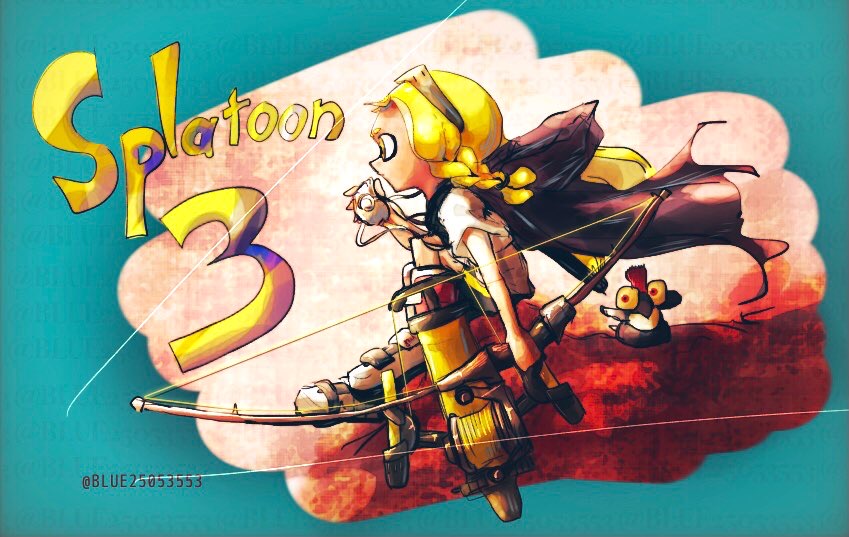 1girl artist_name bike_shorts black_cape blonde_hair blue_border blue_kei border bow_(weapon) braid bulging_eyes cape closed_mouth colored_sclera copyright_name english_text eyewear_on_head female_focus fish flat_chest from_side full_body hair_tie hand_up holding holding_bow_(weapon) holding_weapon hood hooded_cape inkling inkling_girl inkling_player_character jpeg_artifacts knees_up long_hair matching_hair/eyes multicolored_footwear nintendo outside_border profile red_eyes red_hair shirt shoes short_hair short_sleeves sitting smallfry_(splatoon) solo_focus splatoon_(series) splatoon_3 sunglasses torn_cape torn_clothes twitter_username watermark weapon white_shirt yellow_eyes yellow_sclera
