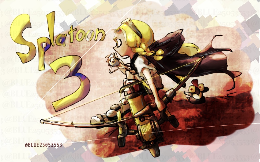 1girl artist_name bike_shorts black_cape blonde_hair blue_kei bow_(weapon) braid bulging_eyes cape closed_mouth colored_sclera copyright_name english_text eyewear_on_head female_focus fish flat_chest from_side full_body hair_tie hand_up holding holding_bow_(weapon) holding_weapon hood hooded_cape inkling inkling_girl inkling_player_character knees_up long_hair matching_hair/eyes multicolored_footwear nintendo profile red_eyes red_hair shirt shoes short_hair short_sleeves sitting smallfry_(splatoon) solo_focus splatoon_(series) splatoon_3 sunglasses torn_cape torn_clothes twitter_username watermark weapon white_shirt yellow_eyes yellow_sclera