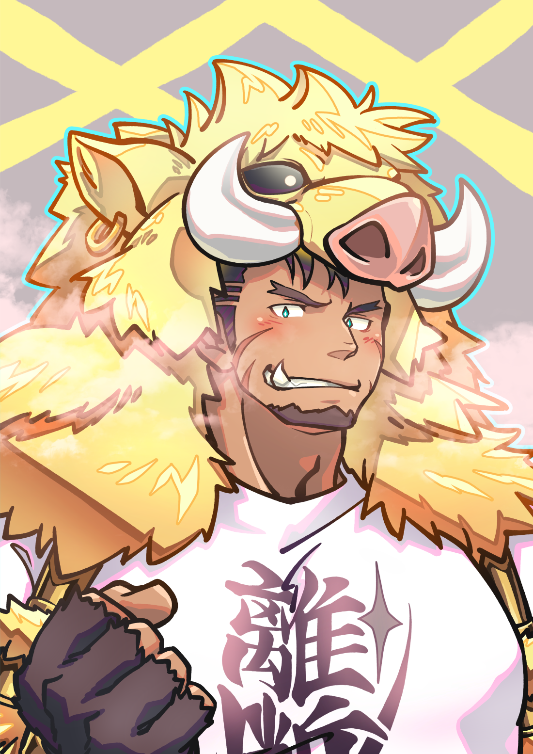 1boy alternate_costume animal_hood bara blue_eyes blush boar_hood body_fur breath brown_hair facial_hair fang forked_eyebrows fur_(clothing) goatee gullinbursti_(housamo) highres hood large_pectorals long_sideburns looking_at_viewer male_focus mature_male muscular muscular_male pectorals shirt short_hair sideburns smile solo tokiniha_netai_(pm8sleepy) tokyo_houkago_summoners upper_body white_shirt