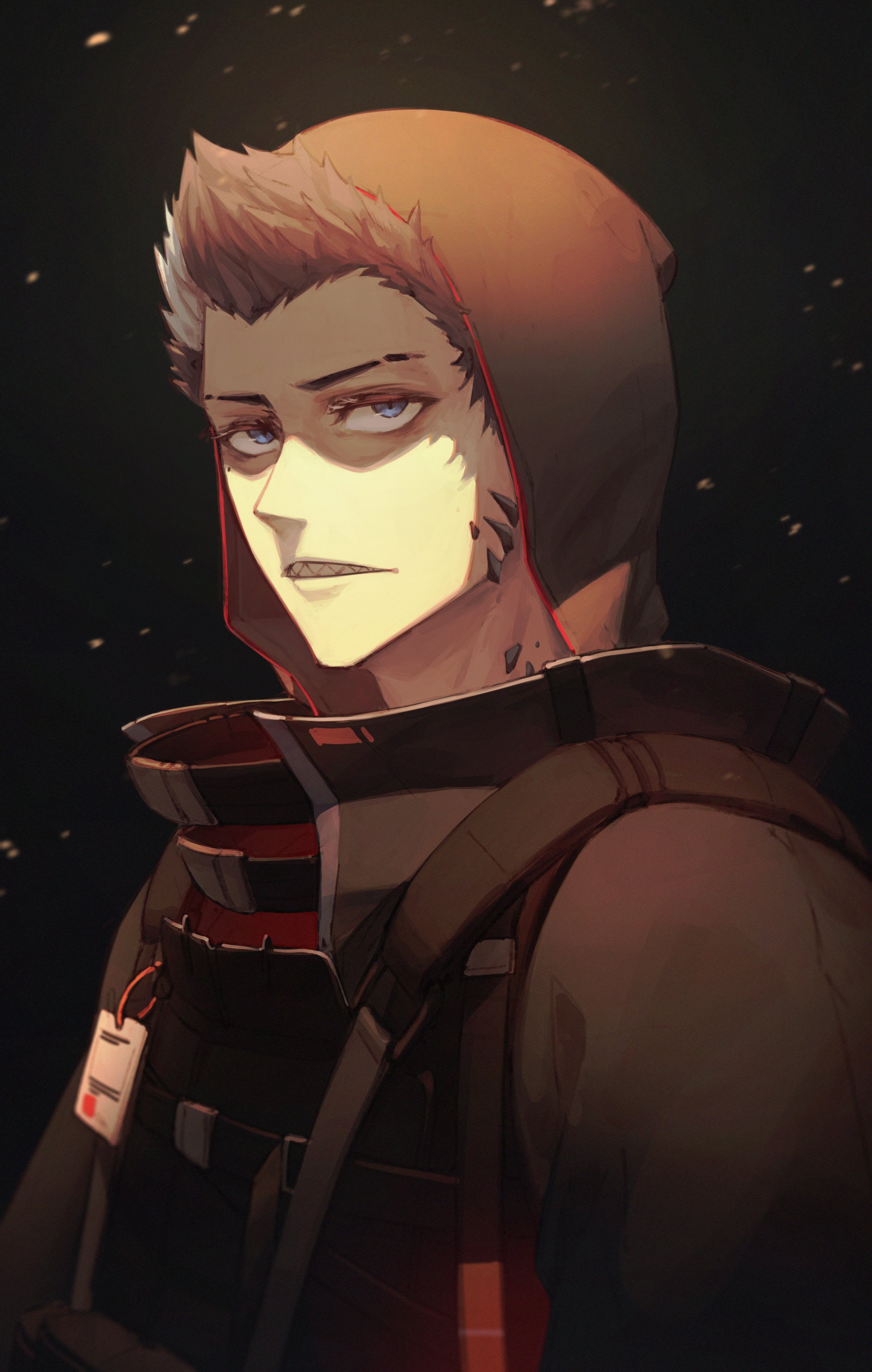 1boy absurdres alternate_costume armor black_background black_hair black_jacket blue_eyes commentary embers english_commentary ex-trident_(vtuber) highres hood indie_virtual_youtuber jacket male_focus parted_lips shark_boy sharp_teeth solo teeth upper_body virtual_youtuber xraydreads