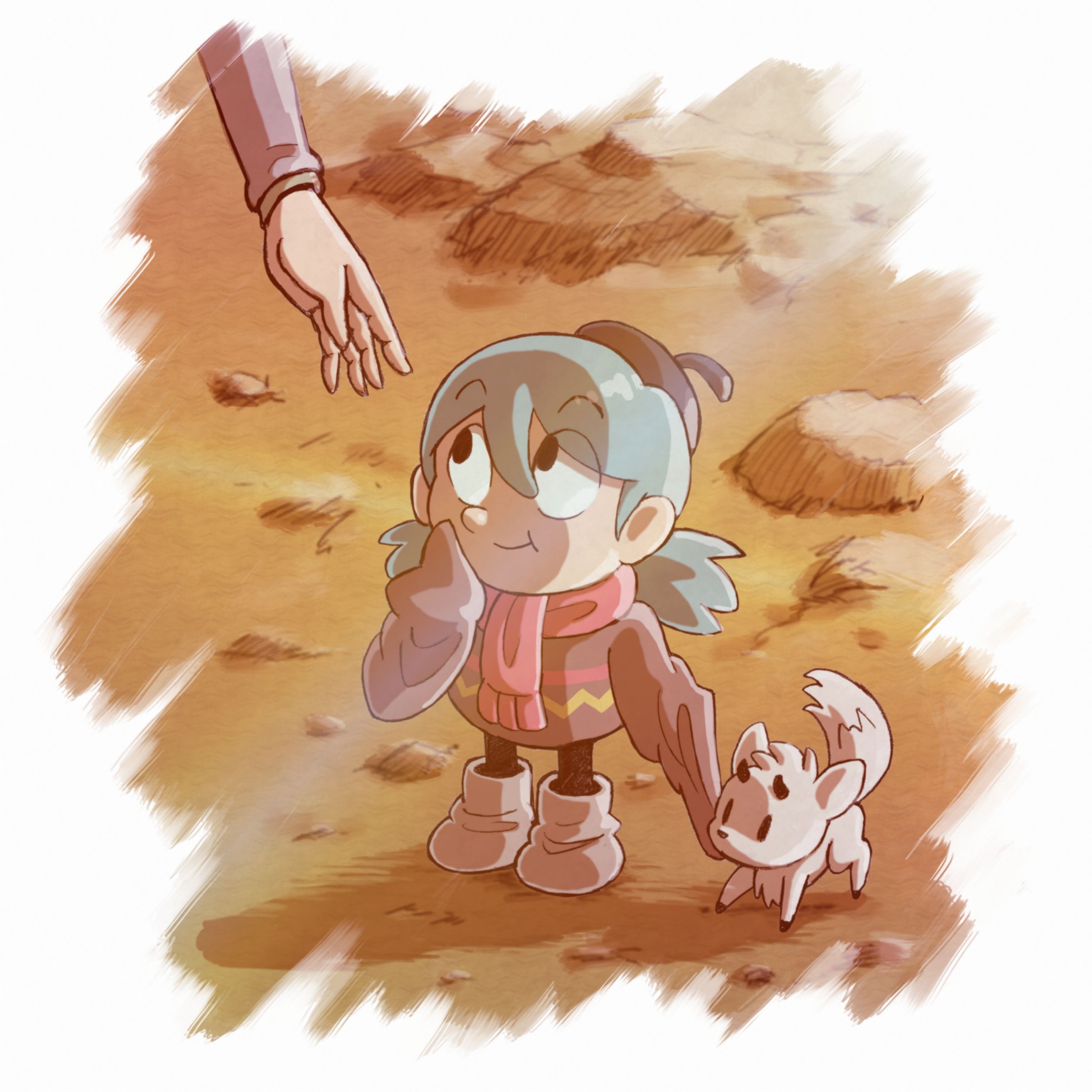 2girls absurdres aged_down beret black_legwear blue_hair boots brown_footwear hat highres hilda_(hilda) hilda_(series) johanna_(hilda) looking_up mother_and_child mother_and_daughter multiple_girls outstretched_hand parent_and_child pulling rock scarf sepia smile sweater twig_(hilda) twintails very_long_sleeves
