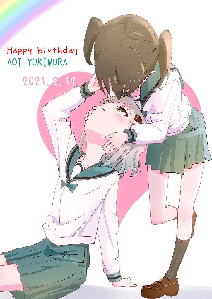 2girls birthday black_hair blush character_name commentary dated green_eyes grey_hair hair_ornament hairclip hand_on_another's_face heart kuraue_hinata leg_up looking_at_another multiple_girls rainbow ryuuma_(norinori_taruto) school_uniform shoes simple_background sitting skirt socks twintails white_background yama_no_susume yukimura_aoi yuri