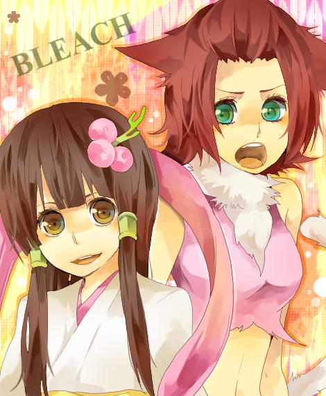 00s 2girls animal_ears bleach bleach:_zanpakutou_ibun_hen brown_hair cat_ears cat_tail copyright_name green_eyes haineko hair_ornament hairpin japanese_clothes kimono kotoma long_hair multiple_girls personification red_hair short_hair tail tobiume zanpakutou_(spirit)