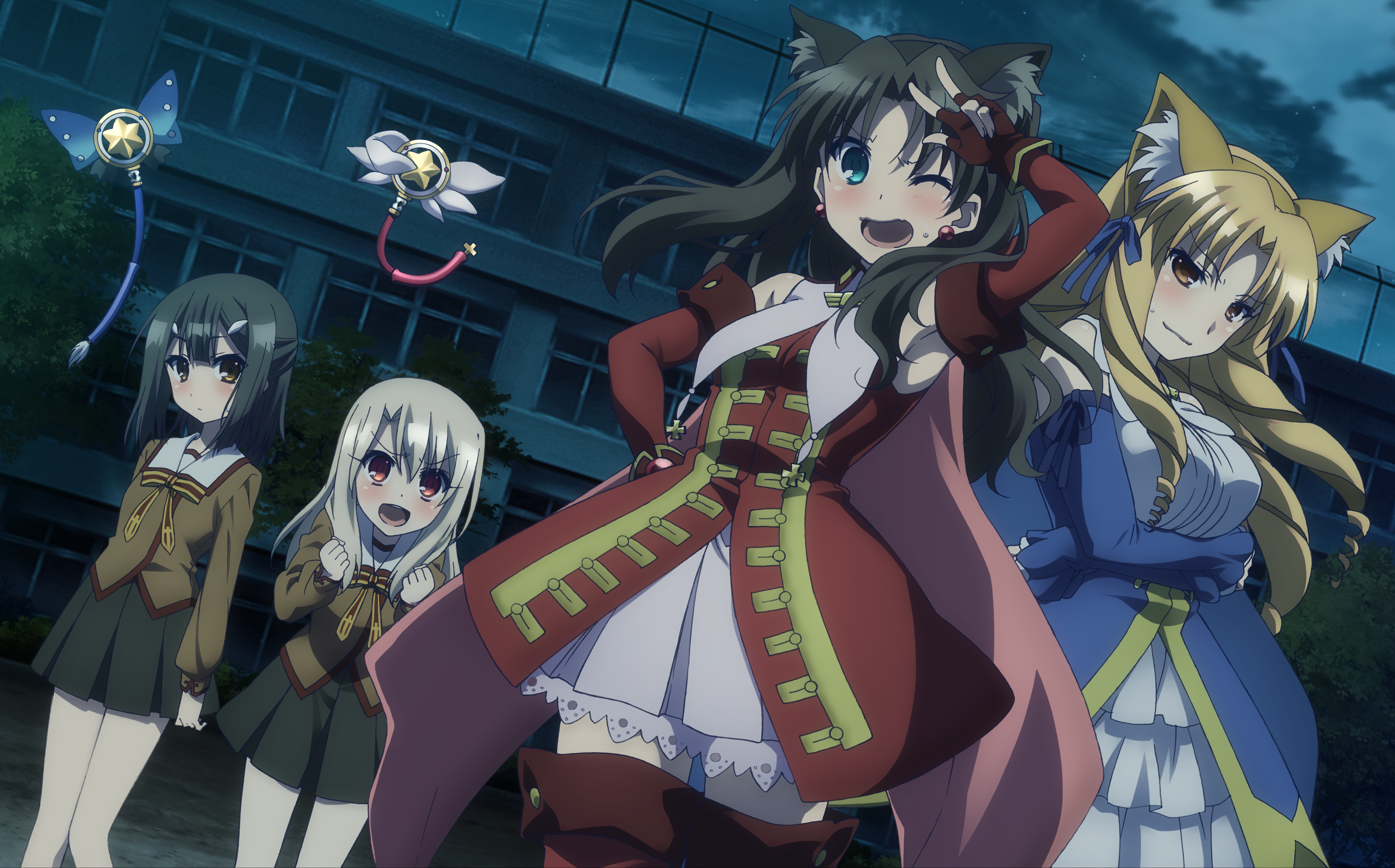 4girls :d absurdres animal_ears armpits bare_shoulders black_hairband black_skirt blonde_hair blue_eyes blue_ribbon blue_sleeves blush boots breast_press breasts brown_eyes brown_hair brown_hairband brown_shirt cat_ears child closed_mouth crossed_arms detached_sleeves dress drill_hair dutch_angle earrings eyelashes fake_animal_ears fate/kaleid_liner_prisma_illya fate_(series) fingerless_gloves floating_hair gloves hair_between_eyes hair_ornament hair_ribbon hairband hairclip hand_on_own_hip highres illyasviel_von_einzbern jewelry kaleido_sapphire large_breasts layered_dress leaning_forward long_dress long_hair long_sleeves looking_at_viewer luviagelita_edelfelt lying magical_ruby magical_sapphire miniskirt miyu_edelfelt multiple_girls neck_ribbon night on_back on_side one_eye_closed open_mouth outdoors pillow pink_dress pleated_skirt red_eyes red_footwear red_gloves ribbon shirt short_dress silver_hair skirt sleeveless sleeveless_dress smile stuffed_animal stuffed_toy sweatdrop textless_version thigh_boots thighhighs tohsaka_rin v-shaped_eyebrows very_long_hair w white_skirt zettai_ryouiki