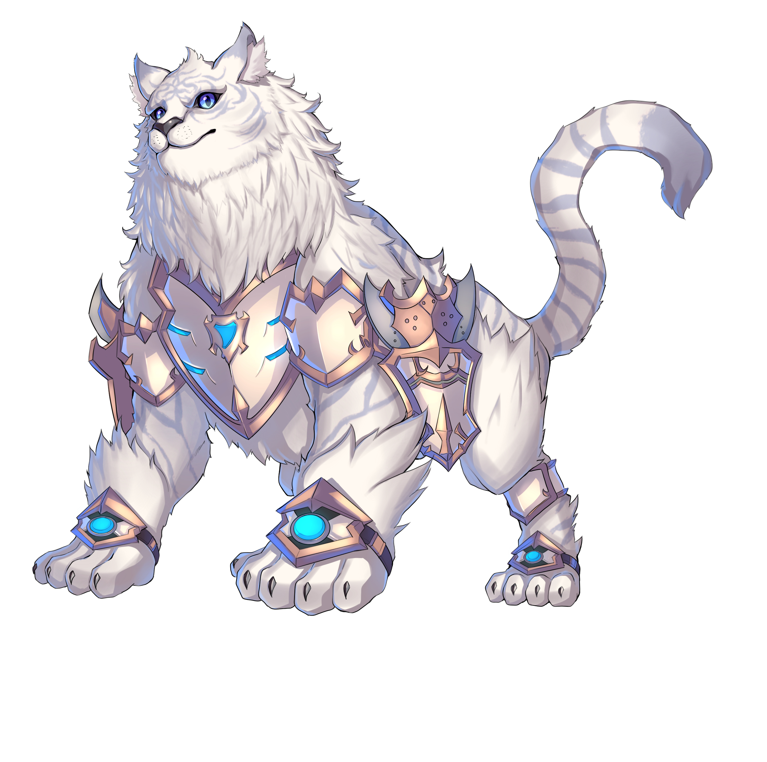 absurdres animal_focus armored_animal blue_eyes dromarch_(xenoblade) full_body hakusai_(hksicabb) highres no_humans simple_background tiger white_background white_fur white_tiger xenoblade_chronicles_(series) xenoblade_chronicles_2