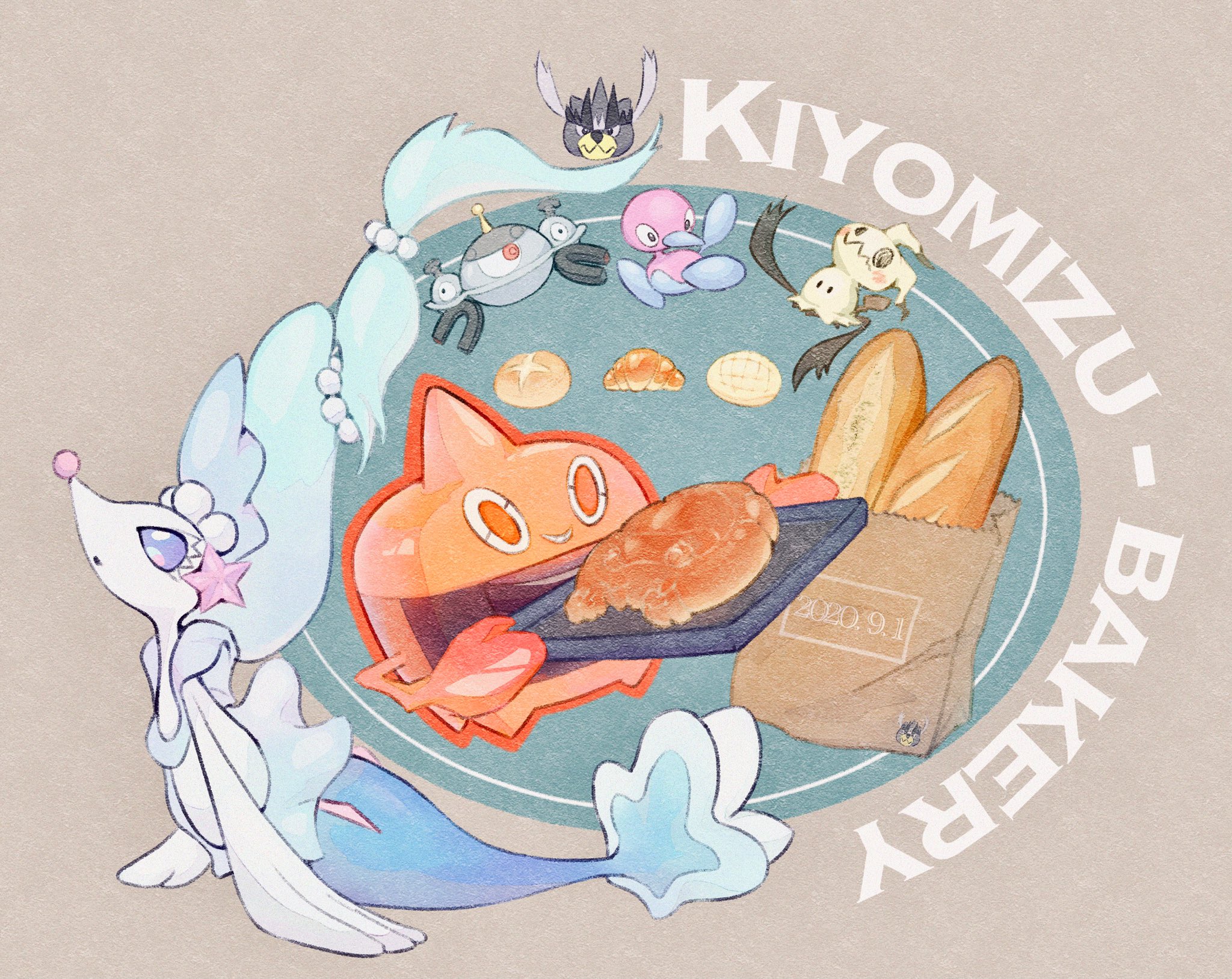 bag baguette baking_sheet bread character_print croissant fireblast food gen_2_pokemon gen_4_pokemon gen_7_pokemon gen_8_pokemon highres legendary_pokemon magnezone mimikyu nintendo no_humans orange_eyes paper_bag pokemon pokemon_(creature) porygon2 primarina rotom rotom_(heat) smile urshifu