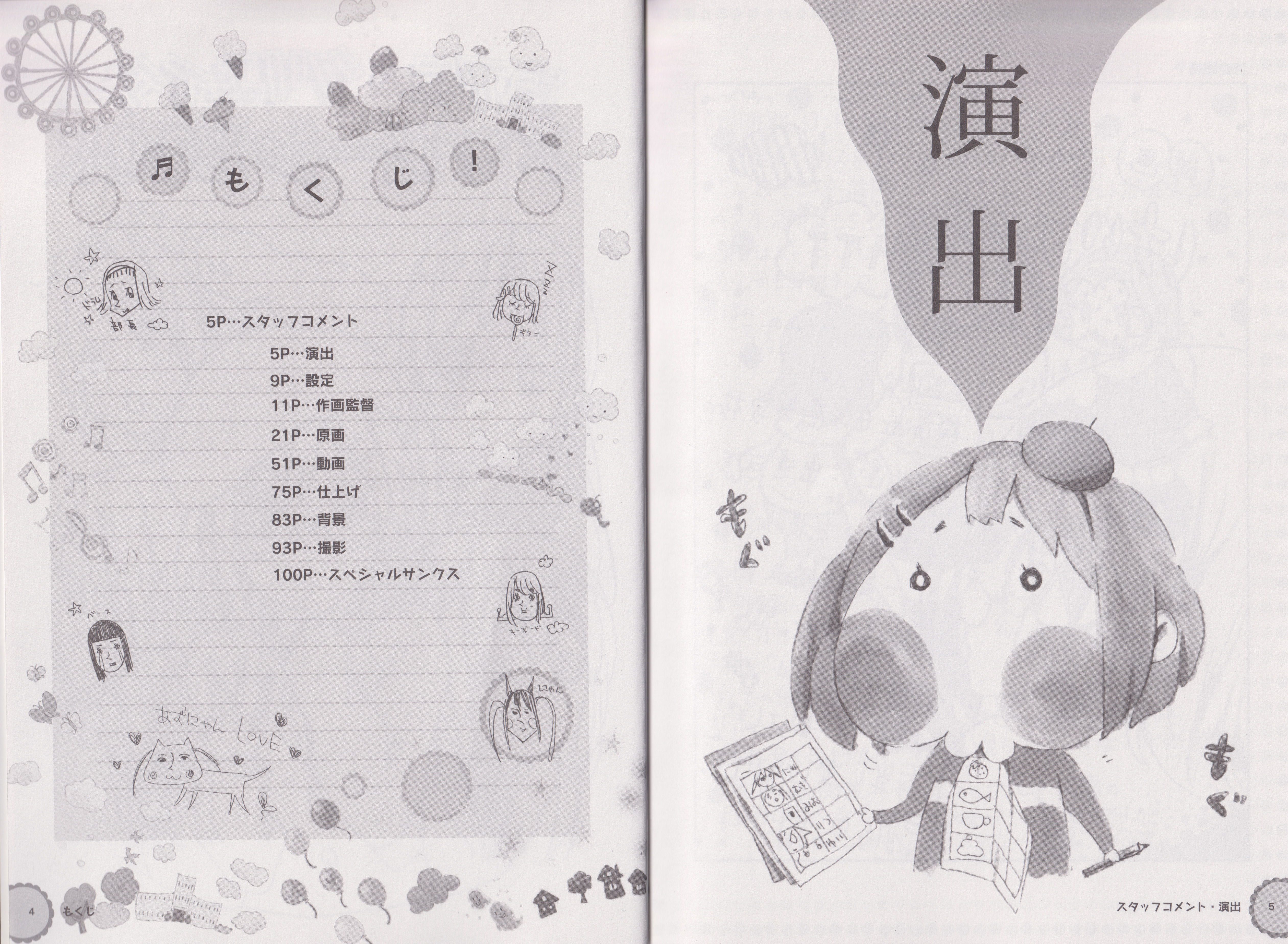 1girl :3 absurdres artbook beret blush blush_stickers chibi deformed doodle ears_visible_through_hair hair_ornament hairclip hat highres hirasawa_yui holding holding_pencil japanese_text k-on! medium_hair notebook official_art pencil raised_eyebrows scan scan_artifacts sidelocks solo translation_request
