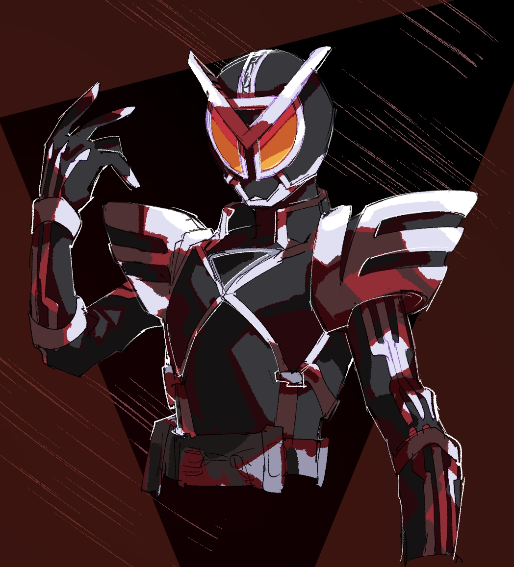 1boy armor belt black_background black_bodysuit blank_eyes bodysuit chikichi cropped_torso hand_up helmet kamen_rider kamen_rider_555 kamen_rider_delta male_focus orange_eyes red_background shoulder_armor simple_background sketch solo two-tone_background upper_body