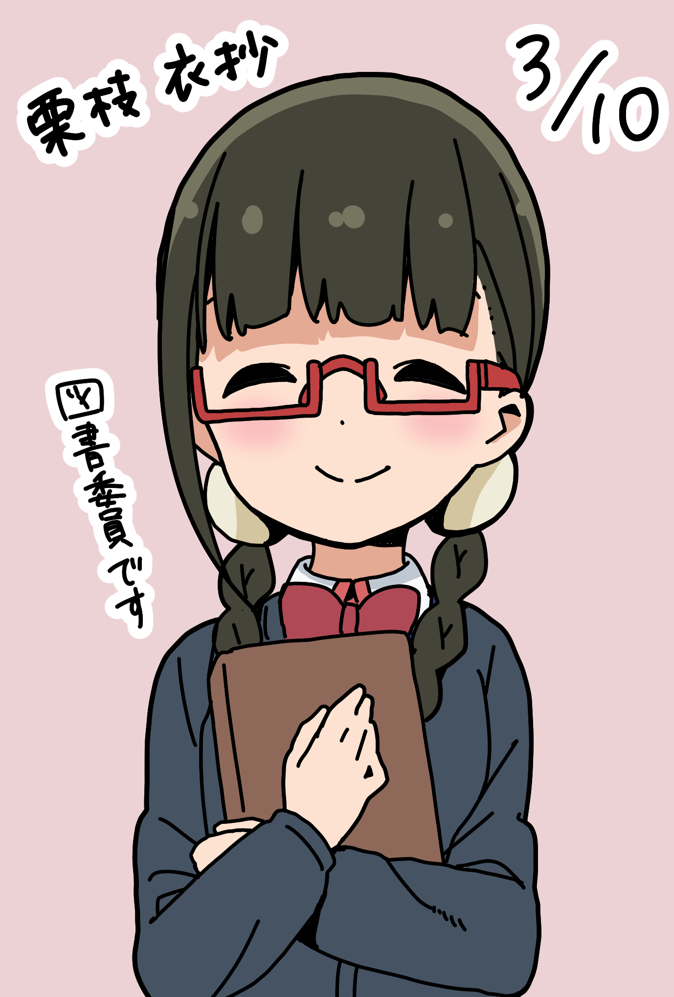 1girl ^_^ black_cardigan black_hair blunt_bangs blush book bow bowtie braid cardigan closed_eyes closed_mouth collared_shirt commentary_request dated dot_nose facing_viewer hair_ornament happy highres hitoribocchi_no_marumaru_seikatsu holding holding_book katsuwo_(cr66g) kurie_ito long_hair long_sleeves pink_background red-framed_eyewear red_bow red_bowtie school_uniform semi-rimless_eyewear shirt simple_background smile solo translation_request twin_braids under-rim_eyewear upper_body white_shirt