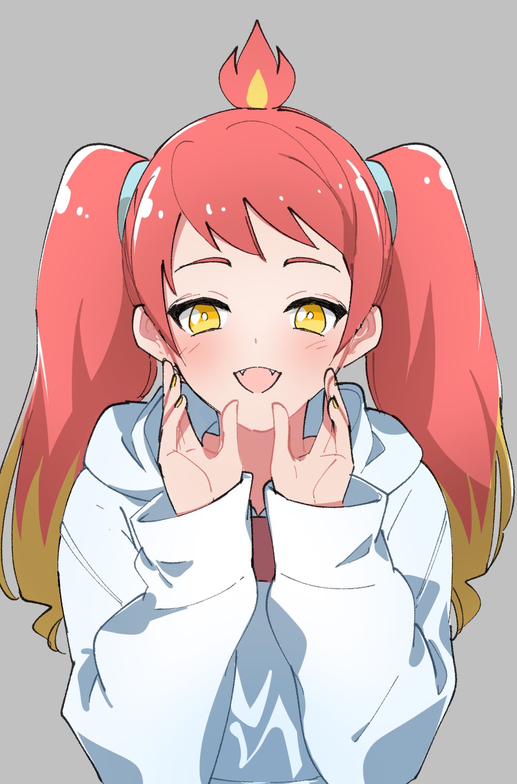 1girl blonde_hair fangs grey_background half-closed_eyes hands_up highres hikasa_tomoshika hood hood_down hoodie kiko_(kikobooom) long_sleeves looking_at_viewer multicolored_hair open_mouth red_hair simple_background sleeves_past_wrists solo twintails two-tone_hair upper_body virtual_youtuber voms white_hoodie yellow_eyes