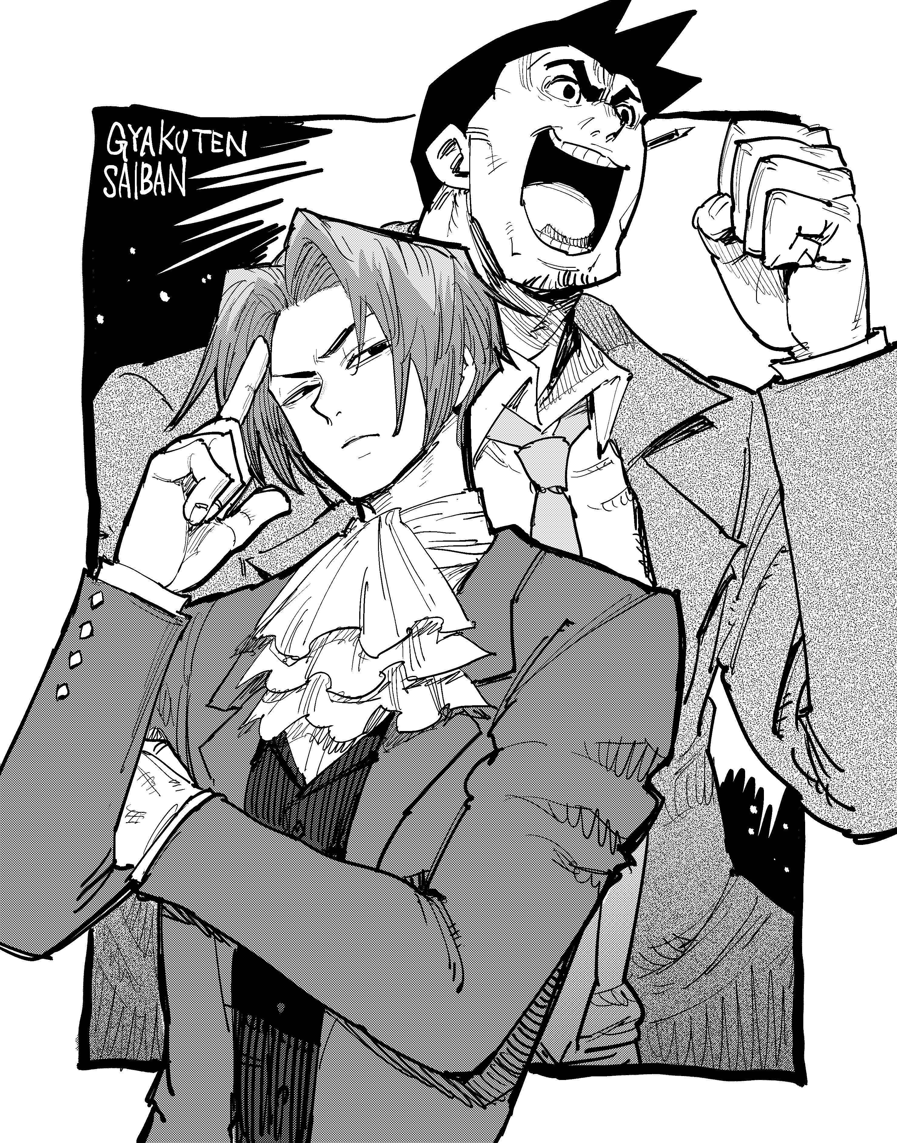 2boys :d absurdres object_behind_ear black_hair border ascot facial_hair finger_to_head formal_clothes greyscale ace_attorney highres dick_gumshoe male_focus miles_edgeworth monochrome multiple_boys nakayama_atsushi necktie open_mouth outside_border pencil short_hair smile stubble suit upper_body white_border