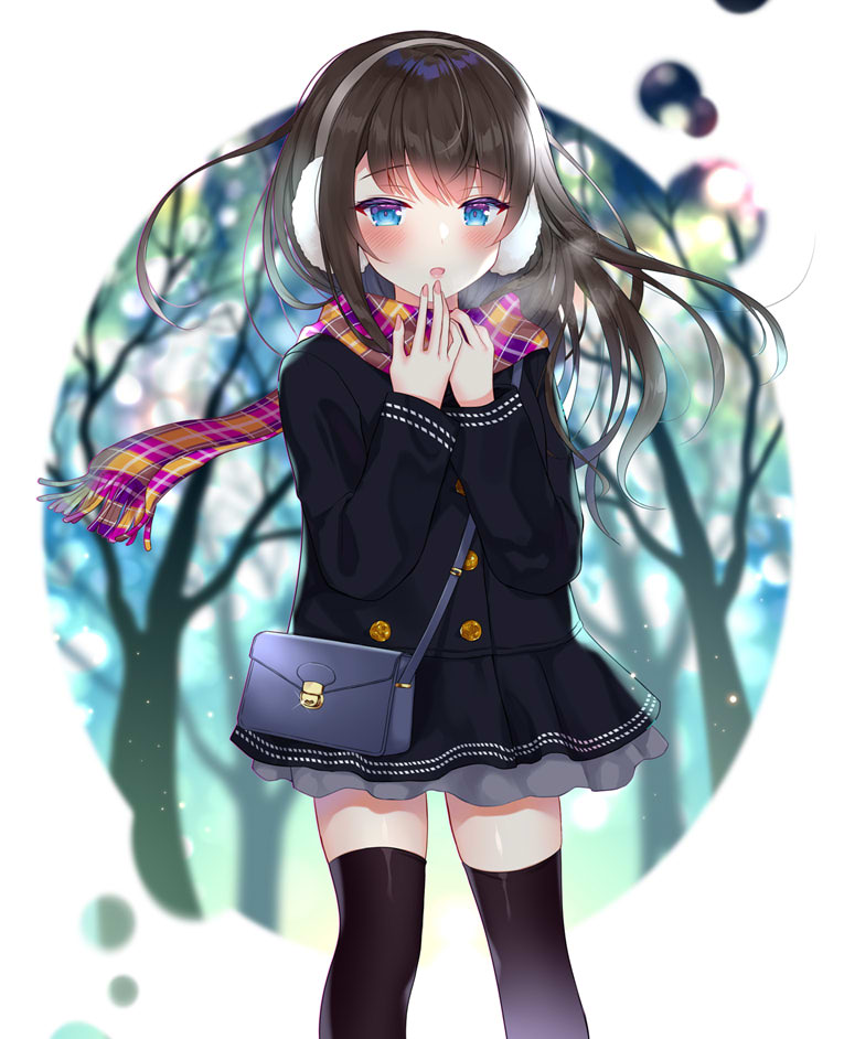 1girl bag black_dress black_hair black_thighhighs blue_eyes blush dress earmuffs feet_out_of_frame hand_up handbag long_hair long_sleeves naomi_(fantasia) original scarf solo thighhighs