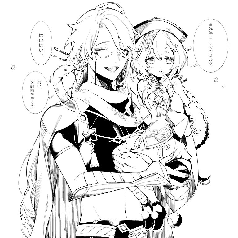 1boy 1girl ahoge animal baizhu_(genshin_impact) bandaged_hand bandages bead_necklace beads braid carrying closed_eyes genshin_impact glasses greyscale hair_between_eyes hat jewelry lebruitestmoi long_hair long_sleeves monochrome necklace ofuda open_mouth pom_pom_(clothes) qingdai_guanmao qiqi_(genshin_impact) short_sleeves simple_background single_braid snake speech_bubble translation_request