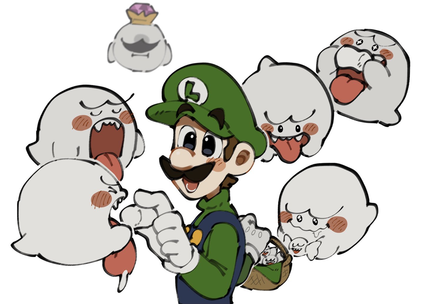1boy basket blue_eyes blush_stickers boo_(mario) brown_hair candy crown closed_eyes facial_hair fangs feeding food ghost hat king_boo long_tongue luigi luigi's_mansion mario_(series) marshmallow mimimim9999 mustache nintendo open_mouth overalls saliva saliva_trail smile tongue tongue_out white_background