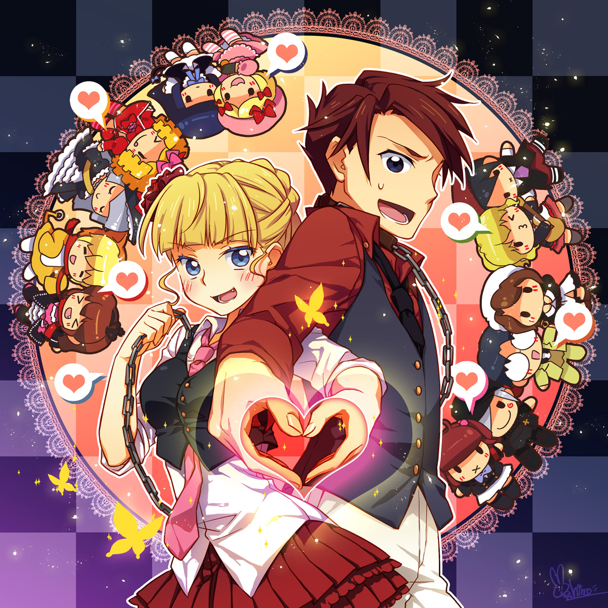 >_< 00s 5boys 6+girls :q x_mouth amakusa_juuza beatrice_(umineko) black_hair blonde_hair blue_hair blush brown_hair bug butterfly chain chibi dress closed_eyes frederica_bernkastel gaap_(umineko) glasses hair_bobbles hair_ornament heart heart_hands heart_hands_duo highres hinohino insect kanon_(umineko) lambdadelta multiple_boys multiple_girls red_hair sakutarou_(umineko) shannon_(umineko) silver_hair tongue tongue_out umineko_no_naku_koro_ni ushiromiya_ange ushiromiya_battler ushiromiya_george ushiromiya_jessica ushiromiya_maria virgilia_(umineko)