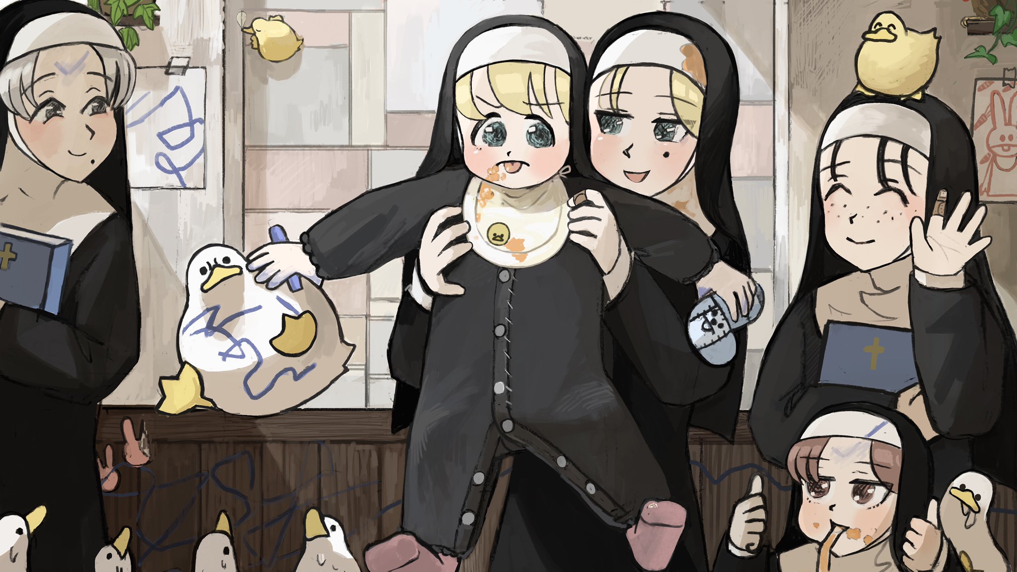 5girls :p ^_^ aged_down animal animal_on_head baby baby_animal bandaid bandaid_on_hand bib bible_(object) bird body_writing book chalk chicken child's_drawing clinging closed_eyes clumsy_nun_(diva) dirty_hands diva_(hyxpk) doodle double_thumbs_up drawing_on_another's_face drinking drinking_straw drooling duck duckling food_on_clothes freckles freckles_nun_(diva) graffiti hanging_plant highres holding holding_animal holding_book holding_chalk holding_stuffed_toy hugging_book hugging_object hungry_nun_(diva) lifting_person little_nuns_(diva) looking_up mole mole_under_eye mole_under_mouth multiple_girls nun nun_headdress on_head on_wall open_hand pink_legwear plant potted_plant slice_of_life smile smug_nun_(diva) socks stained_glass sticker strict_nun_(diva) stuffed_animal stuffed_toy thumbs_up tongue tongue_out traditional_nun