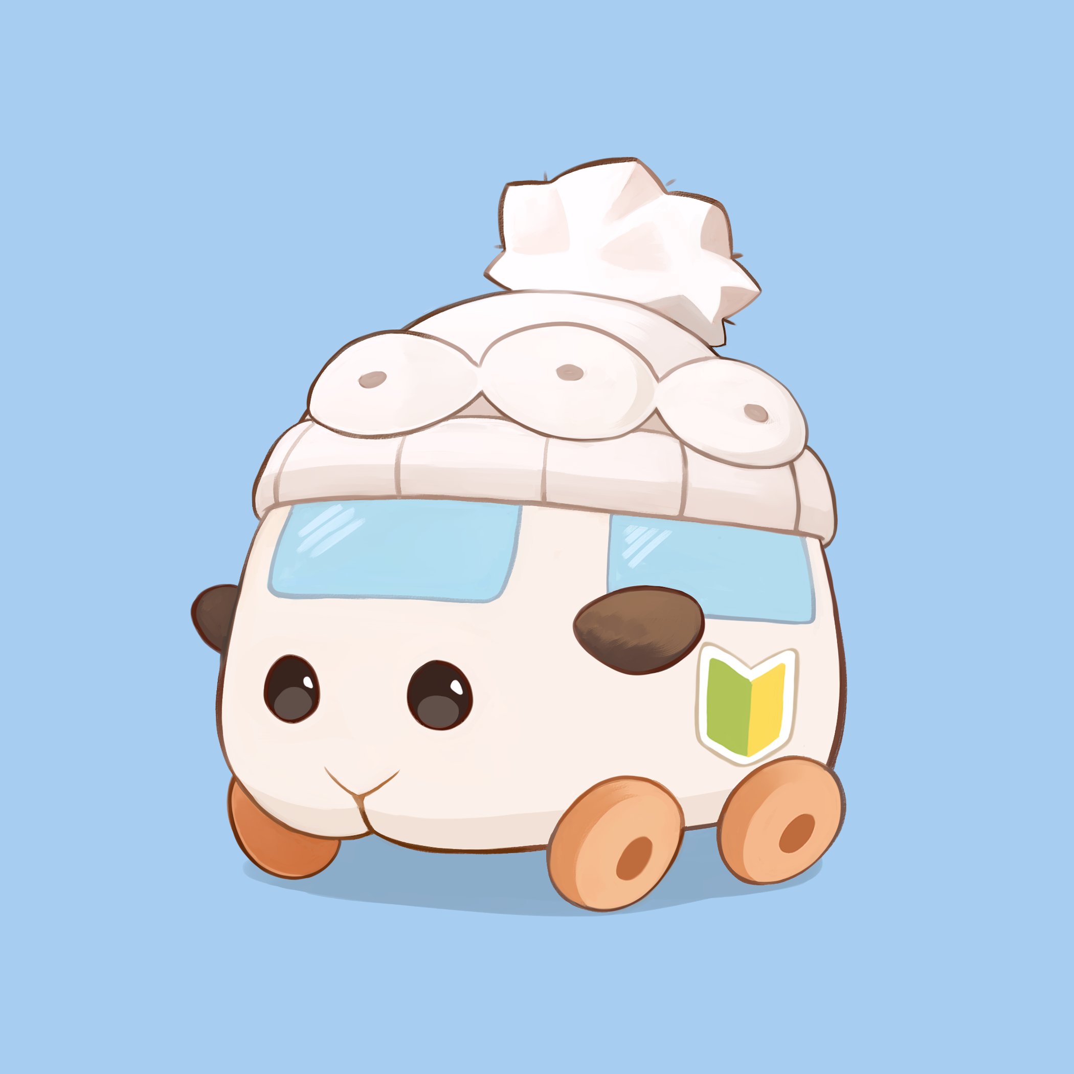 abbey_(pui_pui_molcar) bad_id bad_twitter_id beanie black_eyes blue_background commentary ekoru guinea_pig hat highres molcar motor_vehicle no_humans pom_pom_(clothes) pui_pui_molcar shadow shoshinsha_mark simple_background solo wheel white_hat