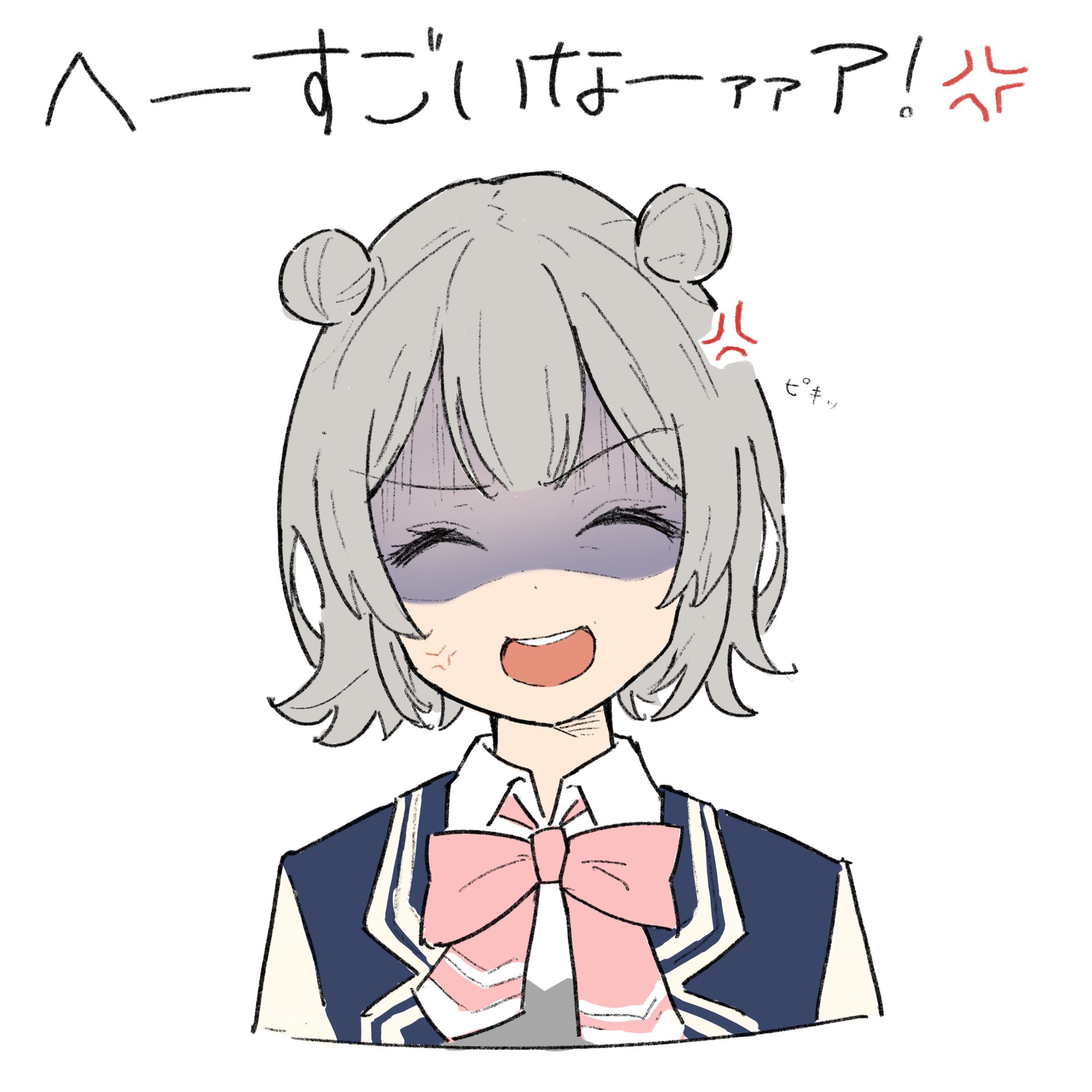 1girl anger_vein ascot blazer blue_jacket bow bowtie cevio closed_eyes commentary cropped_torso double_bun facing_viewer grey_hair grey_sweater hair_bun highres jacket koharu_rikka minatsuki_(m1natsuk1) pink_bow pink_bowtie school_uniform shaded_face short_hair sketch smile solo sweater synthesizer_v translated upper_body v-shaped_eyebrows white_background