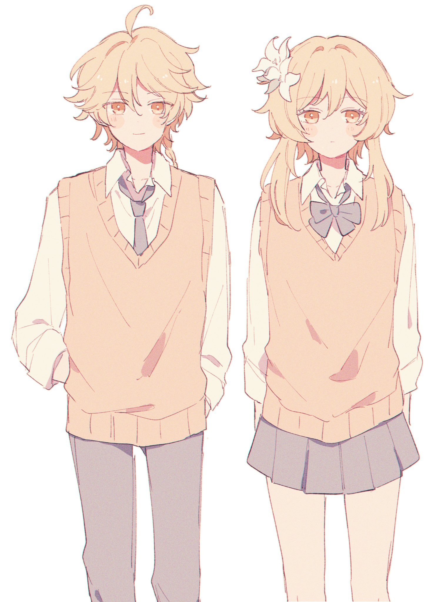 1boy 1girl aether_(genshin_impact) ahoge alternate_costume blonde_hair blue_neckwear blush bow bowtie braid brother_and_sister closed_mouth flower genshin_impact hair_between_eyes hair_flower hair_ornament hand_in_pocket highres long_hair long_sleeves lumine_(genshin_impact) necktie pants pleated_skirt ririco_(gnsn) school_uniform short_hair_with_long_locks siblings sidelocks simple_background single_braid skirt sweater_vest white_background white_flower yellow_eyes