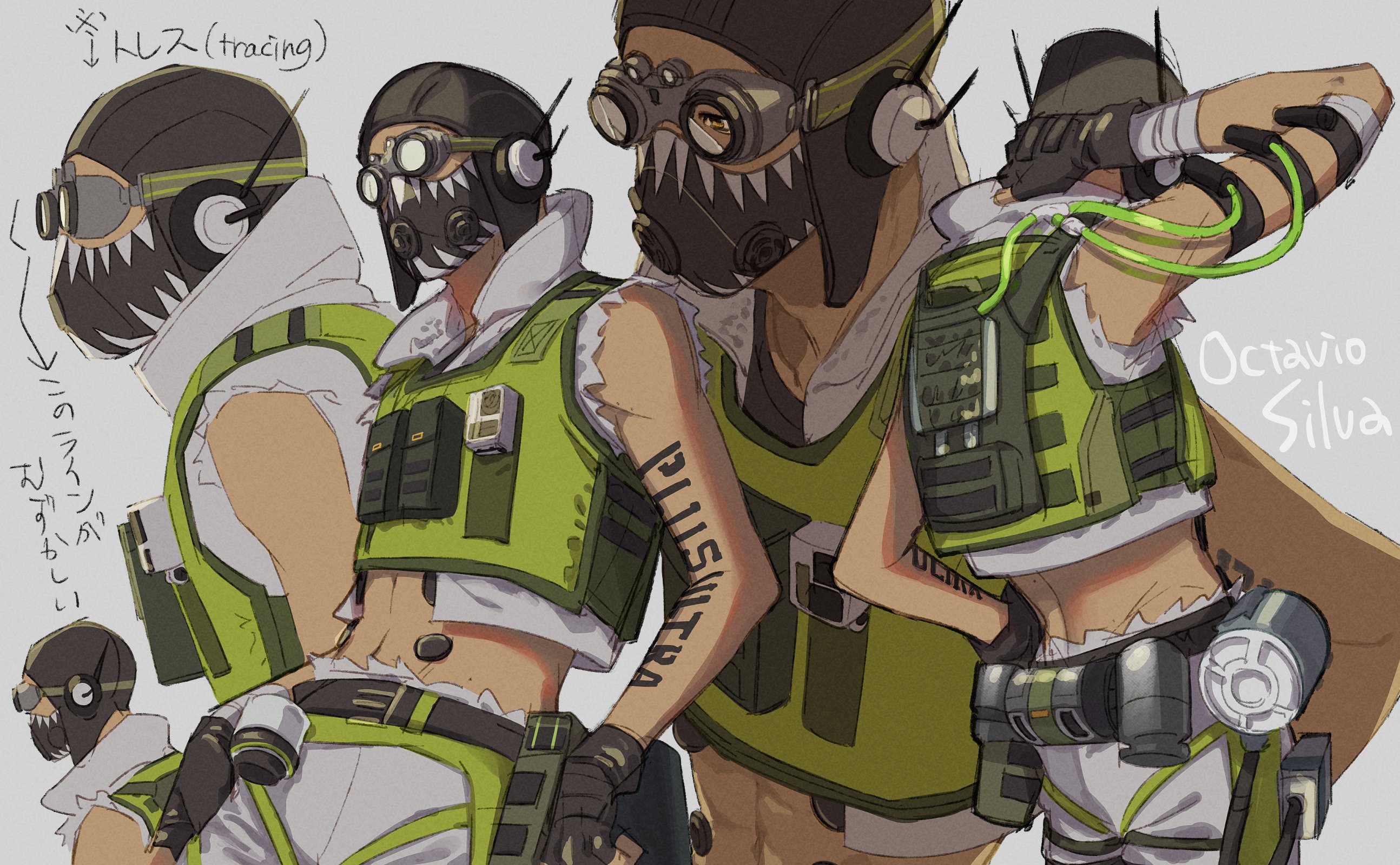 1boy 2gou apex_legends belt black_belt black_gloves black_headwear cable cropped_vest fingerless_gloves gloves goggles green_eyes green_vest grey_background grey_shorts grey_vest highres leaning_back male_focus mask midriff mouth_mask multiple_views navel octane_(apex_legends) shorts vest