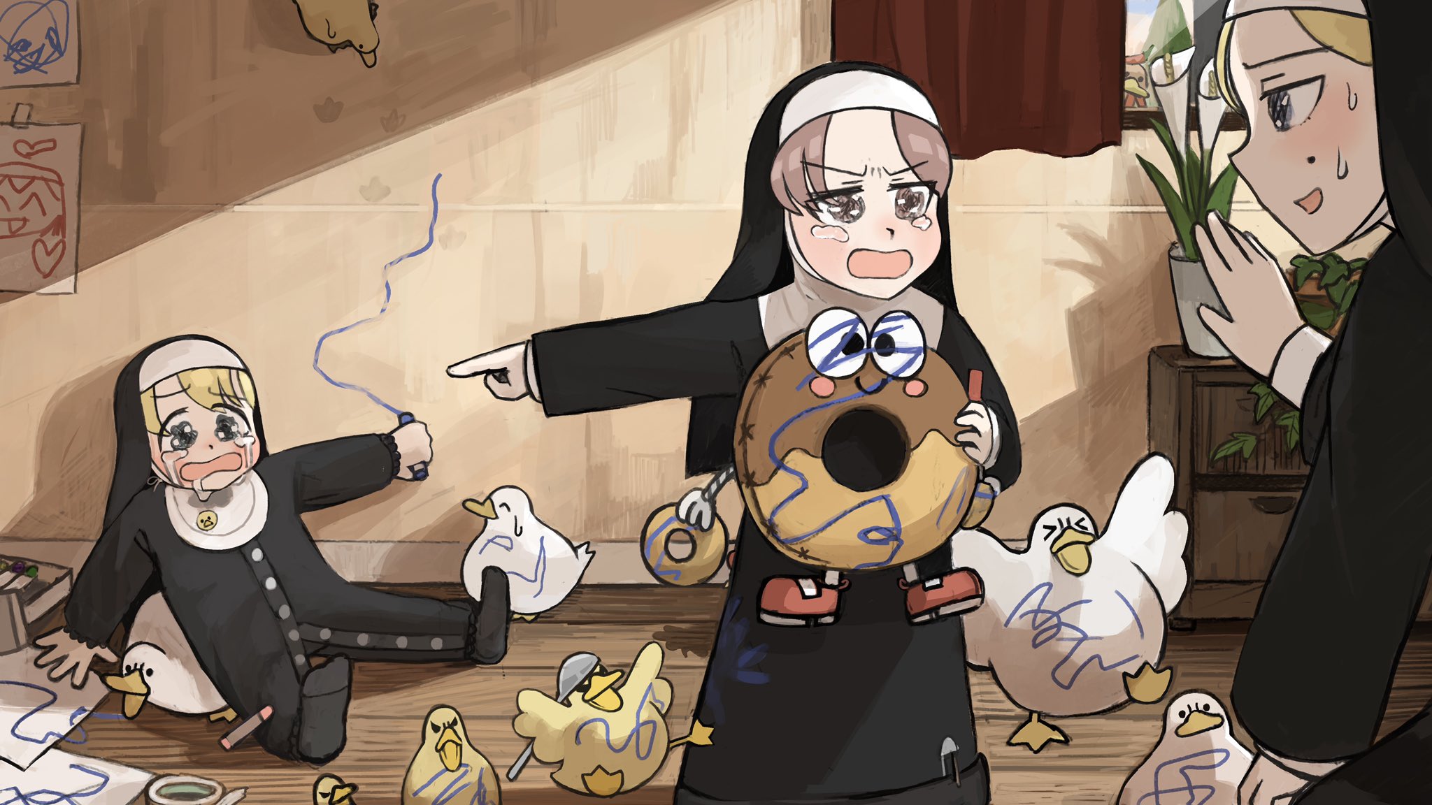 &{ID:5969727 CreatedAt:Fri Mar 19 12:01:22 -0500 2021 Score:10 Width:2048 Height:1152 MD5:3903ddf61ebd60deee47d05764cfccc5 Directory:39/03 Image:3903ddf61ebd60deee47d05764cfccc5.jpg Rating:general Source:https://twitter.com/hyxpk/status/1372940948179578885 Change:1769418172 Owner:danbooru CreatorID:6498 ParentID:0 Sample:1 PreviewHeight:196 PreviewWidth:350 Tags:>_< 3girls ^_^ aged_down angry baby baby_animal bib bird black_legwear blonde_hair blue_eyes body_writing chili_pepper clinging closed_eyes clumsy_nun_(diva) commentary crayon crayon_drawing crying curtains diva_(hyxpk) donut doodle drawer drooling duck duckling english_commentary food food_on_head footprints graffiti habit hand_on_own_knee hand_up highres holding holding_crayon holding_stuffed_toy hungry_nun_(diva) little_nuns_(diva) mole mole_under_eye mouth_hold multiple_girls nun nun_headdress object_on_head on_wall open_hand open_mouth paper peeking_out plant pointing pointing_at_another potted_plant red_eyes red_hair safety_pin slice_of_life socks spoon strict_nun_(diva) stuffed_animal stuffed_toy sweatdrop talking tape tearing_up traditional_nun vase window Title: HasNotes:false HasComments:false FileURL:https://img2.gelbooru.com/images/39/03/3903ddf61ebd60deee47d05764cfccc5.jpg PreviewURL:https://gelbooru.com/thumbnails/39/03/thumbnail_3903ddf61ebd60deee47d05764cfccc5.jpg SampleURL:https://img2.gelbooru.com/samples/39/03/sample_3903ddf61ebd60deee47d05764cfccc5.jpg SampleHeight:478 SampleWidth:850 Status:active PostLocked:0 HasChildren:false IsVideo:false DisplayDate:19.03.2021 12:01}