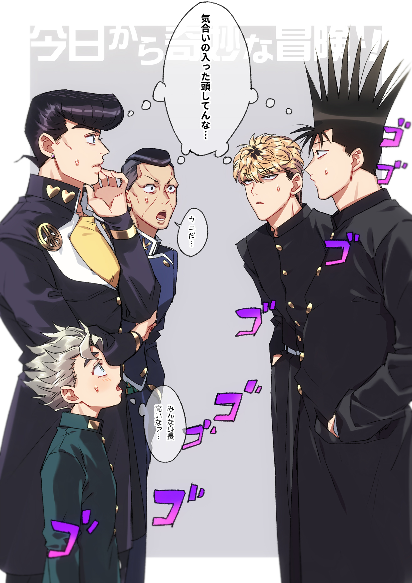 5boys text_background black_eyes black_hair black_jacket black_pants blonde_hair blue_eyes blue_jacket blue_pants blurry blush border commentary_request crossover depth_of_field diamond_wa_kudakenai eye_contact gakuran green_eyes green_jacket green_pants grey_background grey_hair hair_between_eyes hand_in_pocket hands_in_pockets heart height_difference higashikata_josuke highres hirose_koichi itou_shinji jacket jojo_no_kimyou_na_bouken k_(gear_labo) kyou_kara_ore_wa!! long_sleeves looking_at_another looking_up male_focus menacing_(jojo) mitsuhashi_takashi multicolored_hair multiple_boys nijimura_okuyasu open_mouth outside_border pants peace_symbol pompadour school_uniform shared_thought_bubble simple_background sound_effects speech_bubble spiked_hair standing sweatdrop thick_eyebrows thought_bubble translation_request two-tone_hair white_border yen_sign