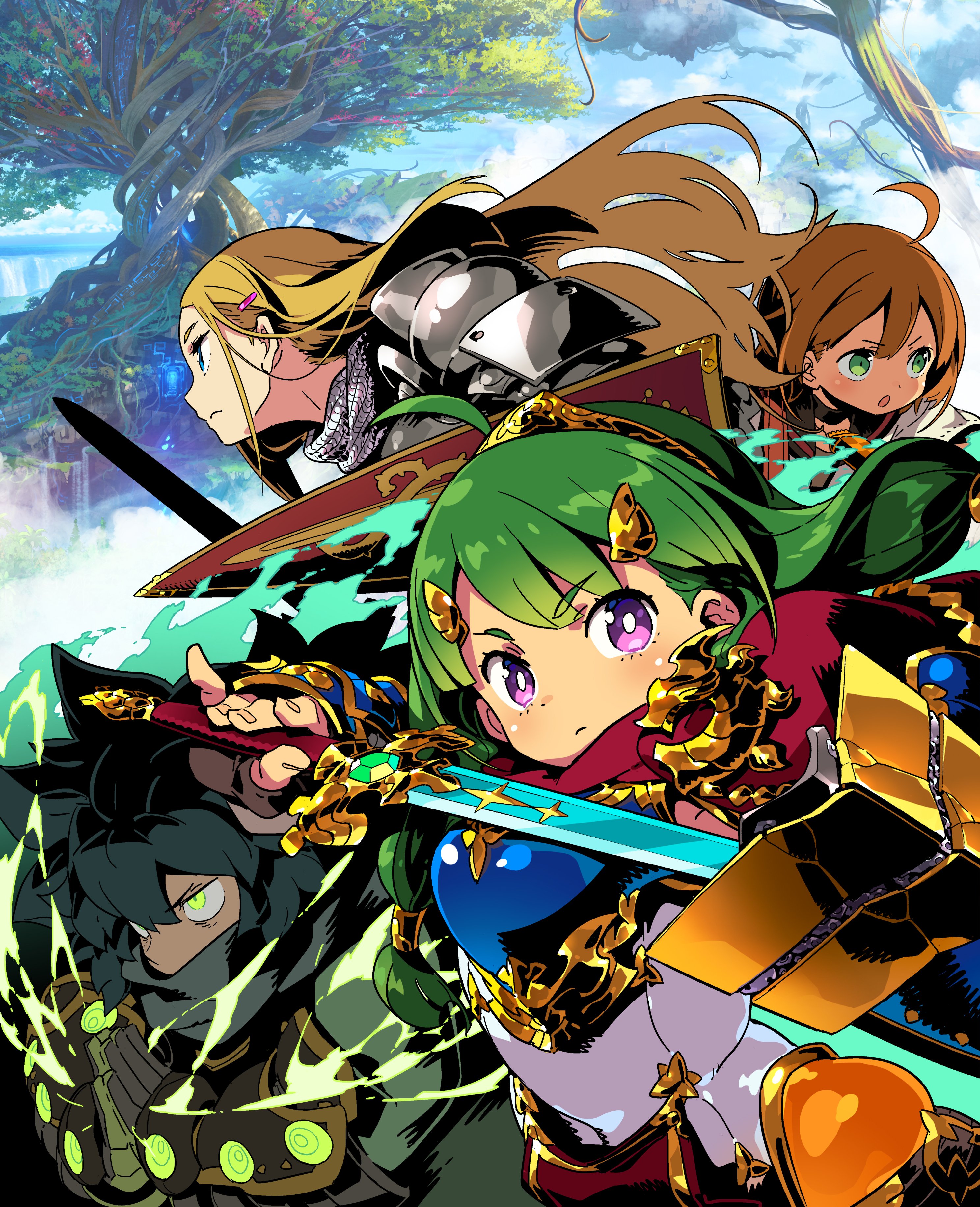 1boy 3girls absurdres ahoge alchemist_(sekaiju) alchemist_1_(sekaiju) armor aura blonde_hair blue_eyes bright_pupils cape commentary_request etrian_odyssey fingerless_gloves gauntlets gloves gold_trim green_eyes green_hair hair_ornament hairclip hero_(sekaiju) hero_2_(sekaiju) highres himukai_yuuji holding holding_shield holding_sword holding_weapon long_hair medic_(sekaiju) medic_2_(sekaiju) multiple_girls official_art orange_hair paladin_(sekaiju) paladin_2_(sekaiju) pauldrons profile purple_eyes red_cape scarf scarf_over_mouth sekaiju_no_meikyuu sekaiju_no_meikyuu_x shield short_hair shoulder_armor sky sword tree weapon